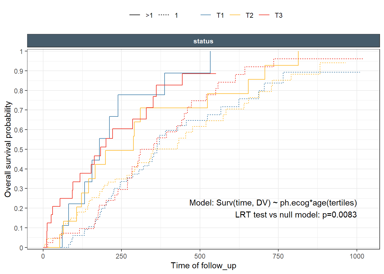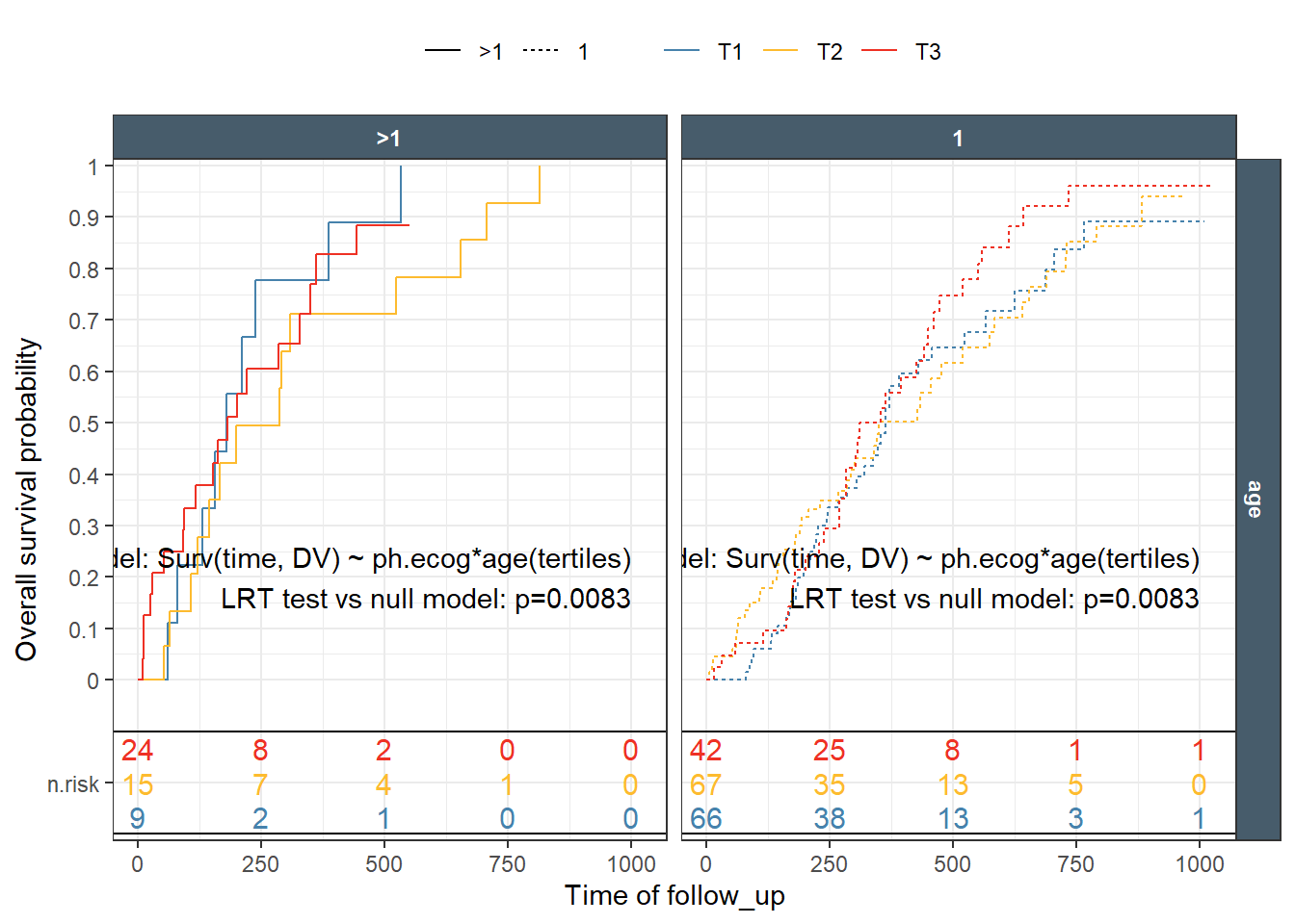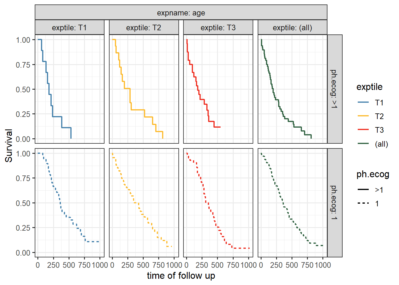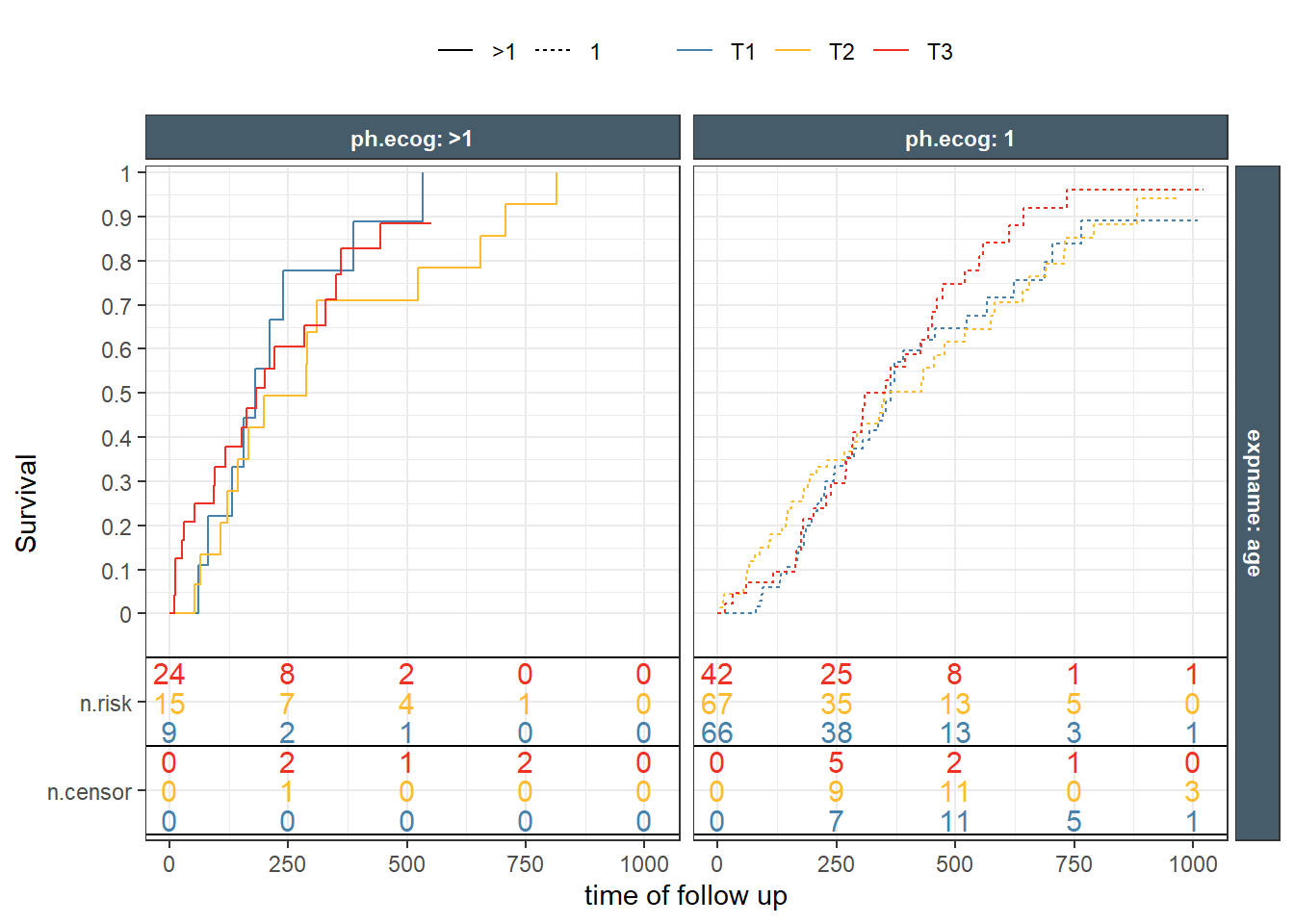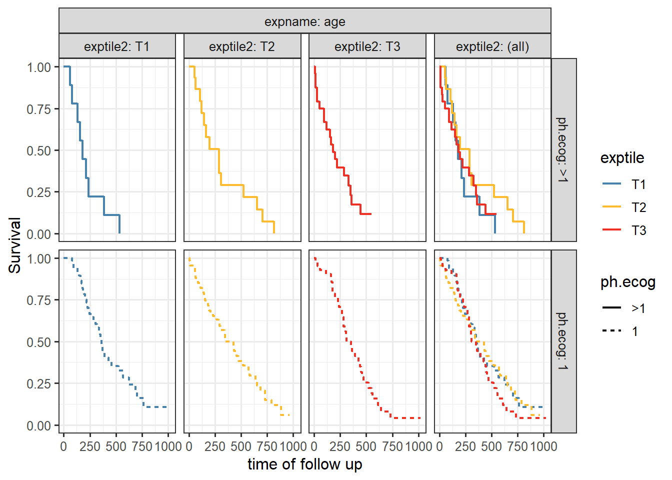 This is a nice Kaplan-Meir plot that shows the K-M estimate by ecog status and both overlaid in the facet margin (all) panel. To include the effects of continuous variables, we will need to “bin” it. I will use age as a example predictor binning it by tertiles. Some nice features are outlined below: