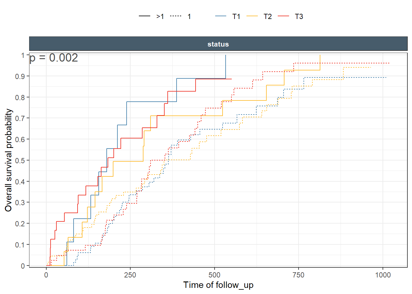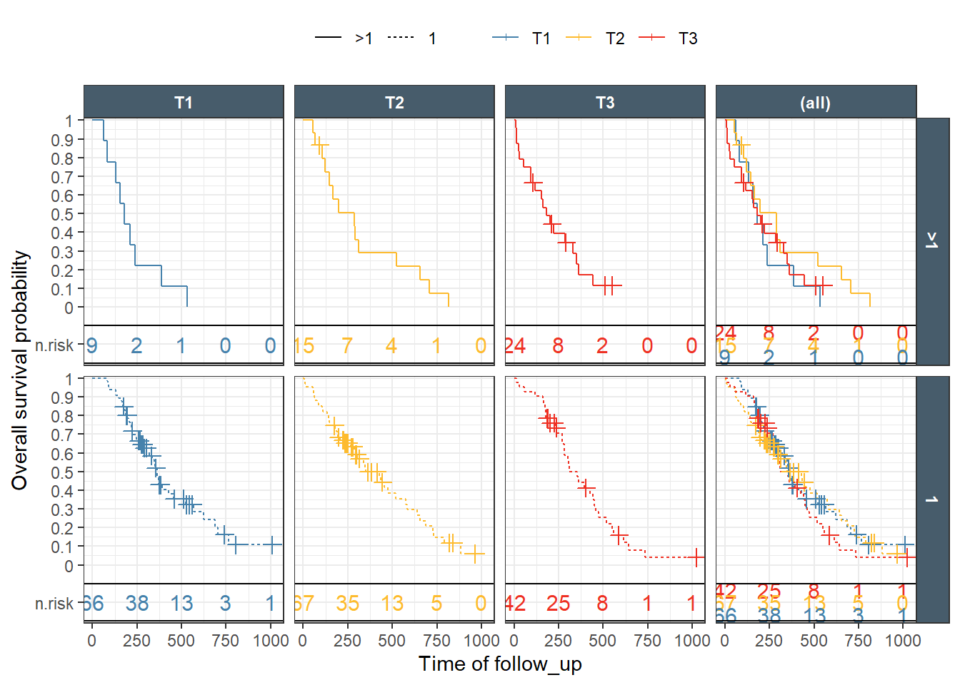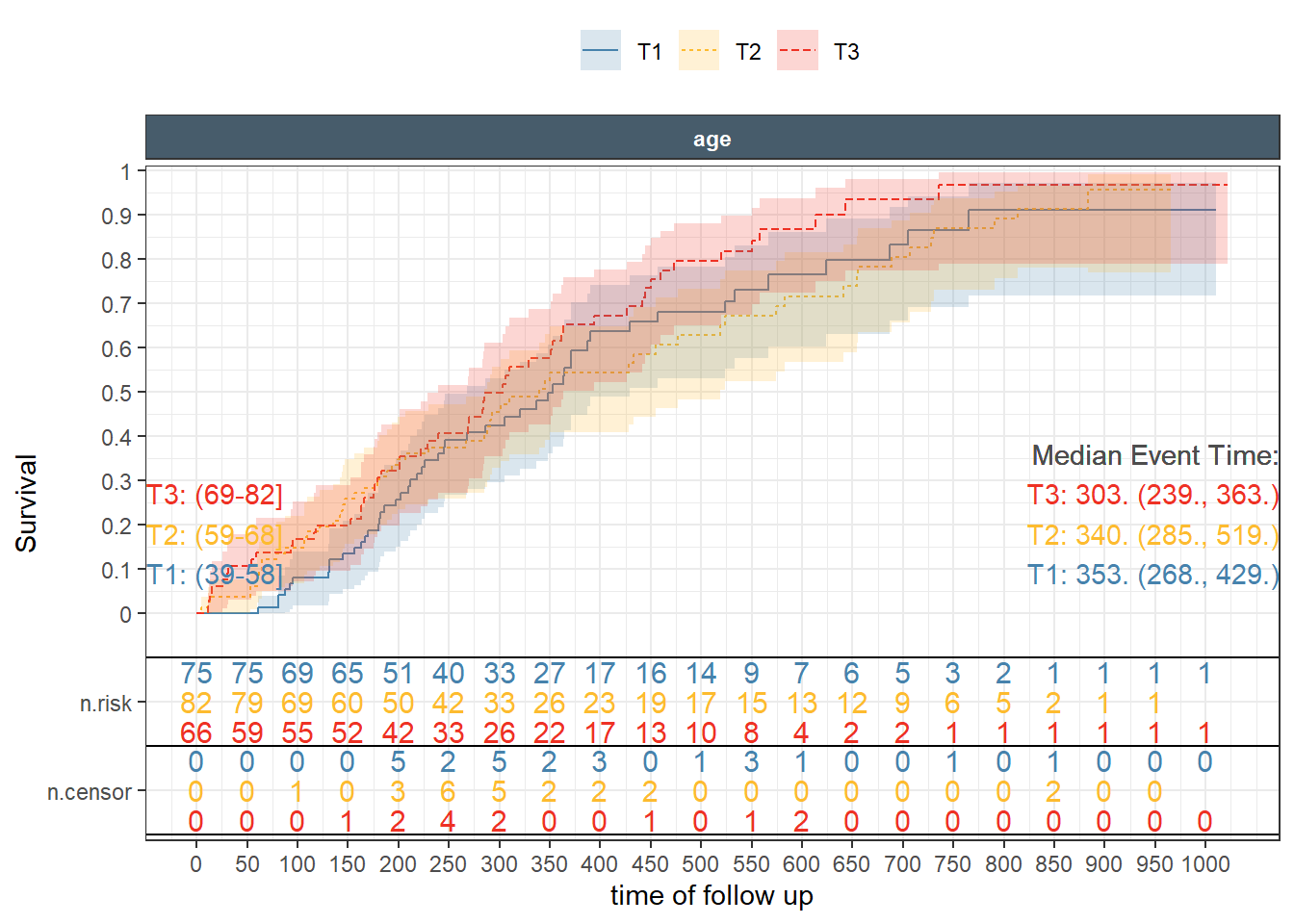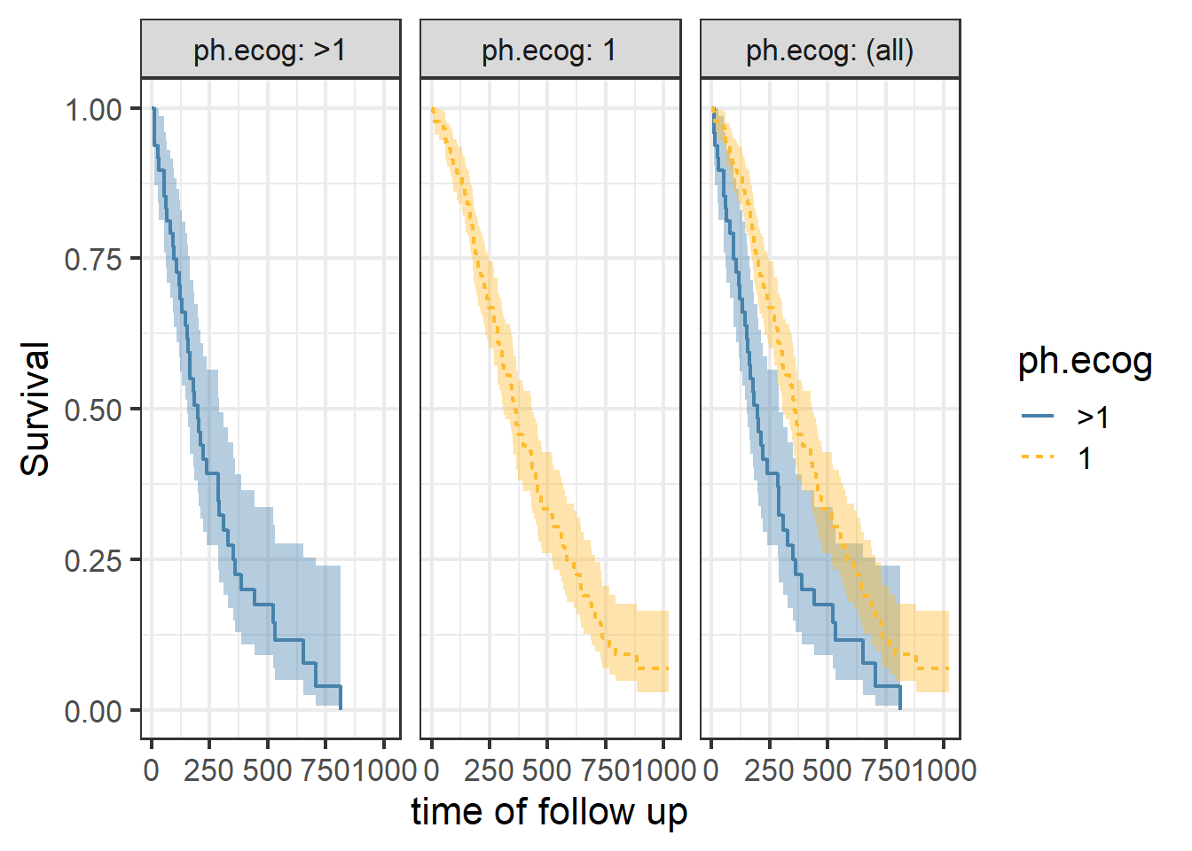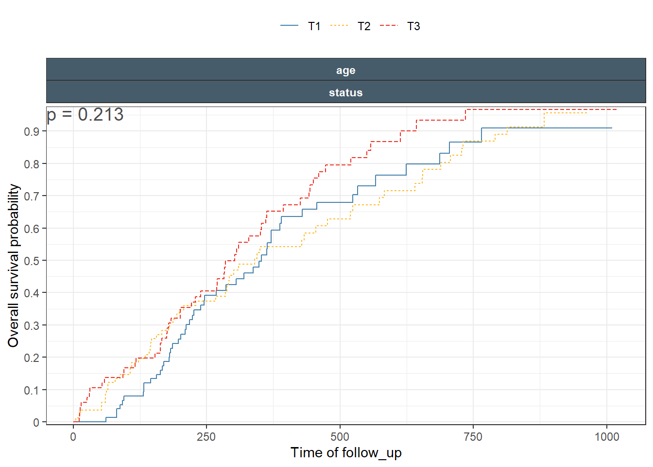 This is a nice Kaplan-Meir plot that shows the K-M estimate by ecog status and both overlaid in the facet margin (all) panel. To include the effects of continuous variables, we will need to “bin” it. I will use age as a example predictor binning it by tertiles. Some nice features are outlined below: