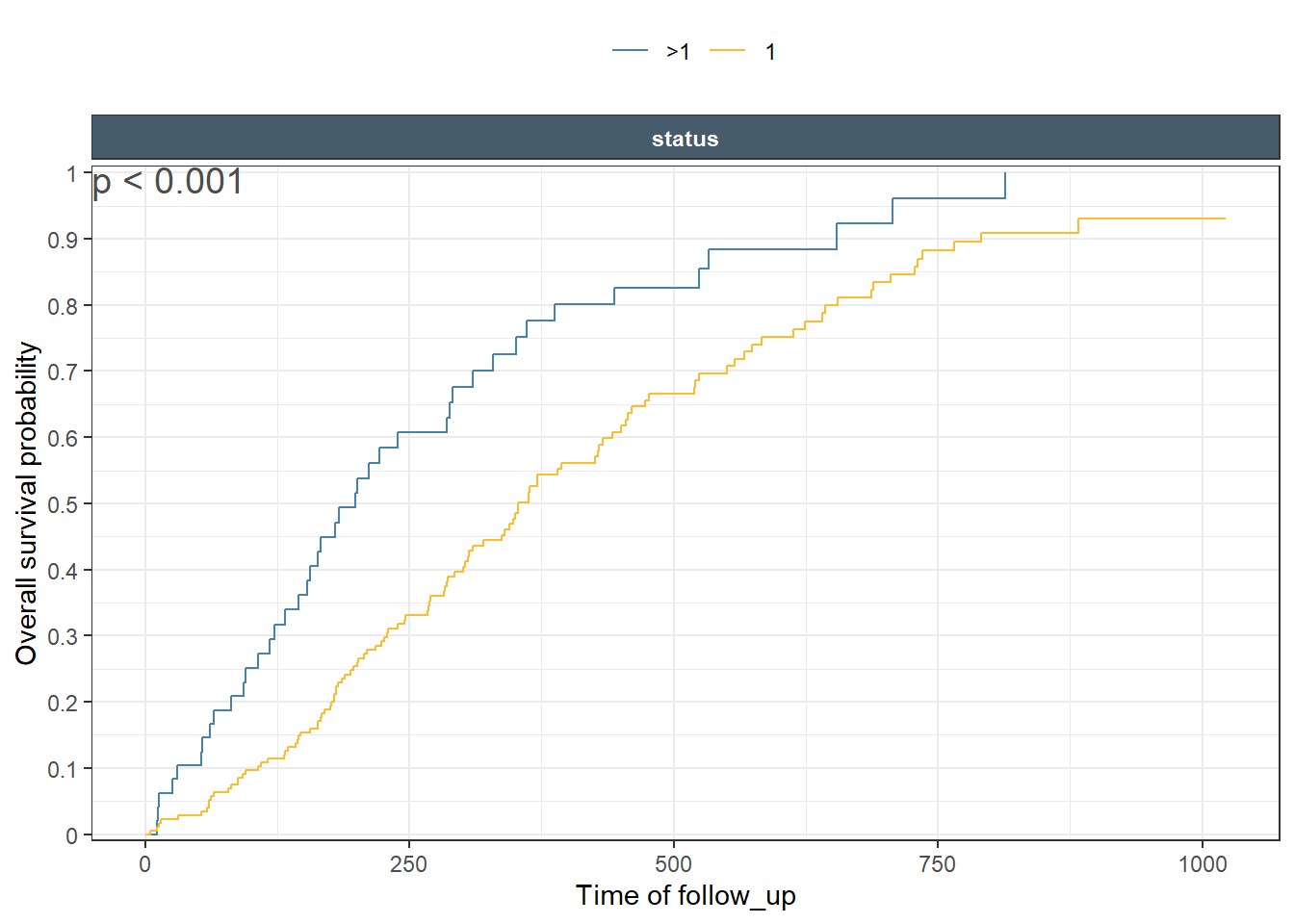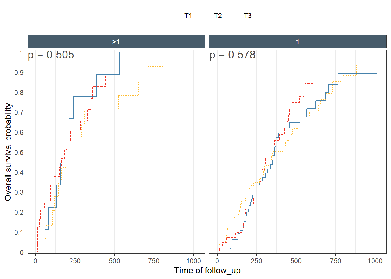 One would expect that the p-values shown in each panel are specific for the subset of panel data comparing the curves. While the case of single split, are clear, things get out of control fast when we have multiple splits/predictors and then deciding on what particular test we really want. Is it overall on all data ar within a specific strata/subset?
