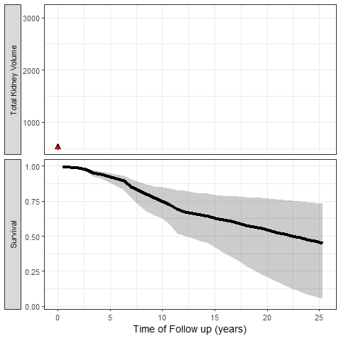 We can also simulate clinical trial inclusion criteria and see how these patients TKV trajectories and probabilities of events can be projected: