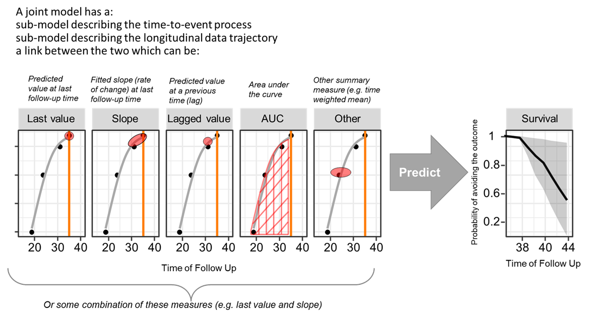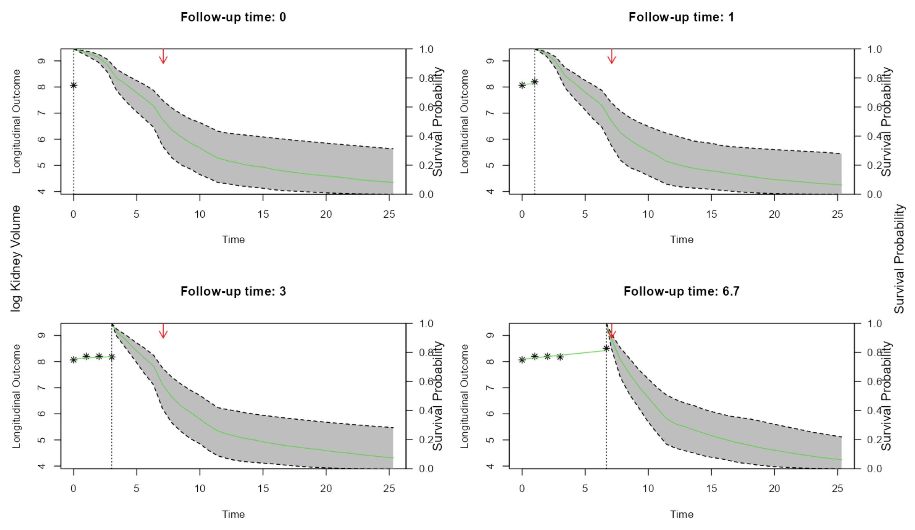 The most exciting application of Joint Models is the capability to simulate trajectories of time and illustrate its impact on the probability of the event: