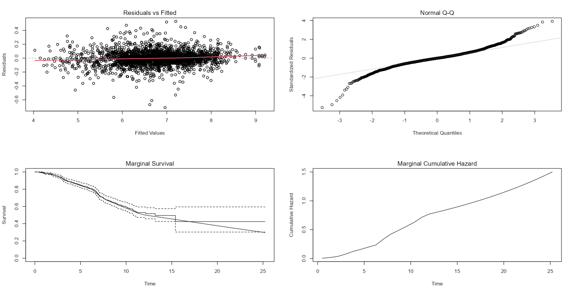 Convergence: 0 Notice how in the output of the summary of the jointmodel the association Assoct between the predicted “value” and hazard of the event is highly significant <0.0001. To get the hazard ratio and its 95% confidence interval we exponentiate the output of confint. We can also output automated diagnostics using an automatic plot method on JM objects.
