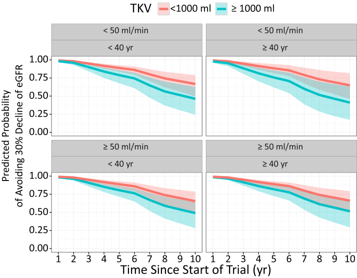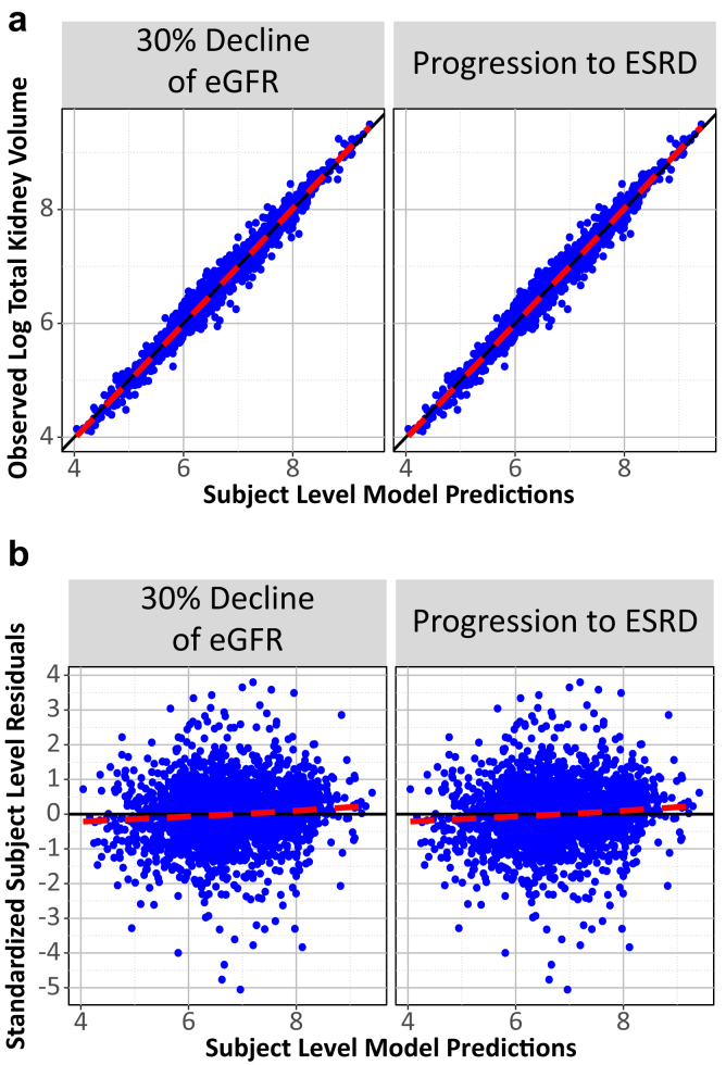 In a first step, linear mixed-effect models with a random intercept were used to fit ln-transformed TKV values, keeping only patients with at least 2 TKV measurements separated by at least 6 months apart. Baseline TKV was defined as the first TKV measurement for a subject, whereas baseline age was the age associated with the first TKV measurement. Correlated random effects on slope and intercept was used