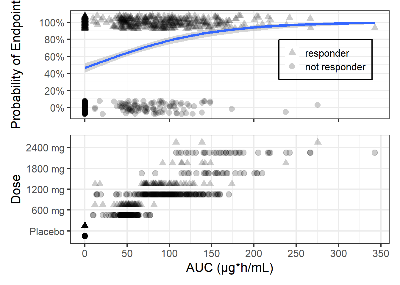 In this post I will provide the code and thinking process behind the figure shared in my first blog post. We will start with a simpler version where we show the Endpoint versus exposures, which in this case are areas under the drug concentrations curves (AUC) on top. And at the bottom, the individual AUCs by dose level with a different symbol by responder status: responder (as triangles) and not responder (as circles).