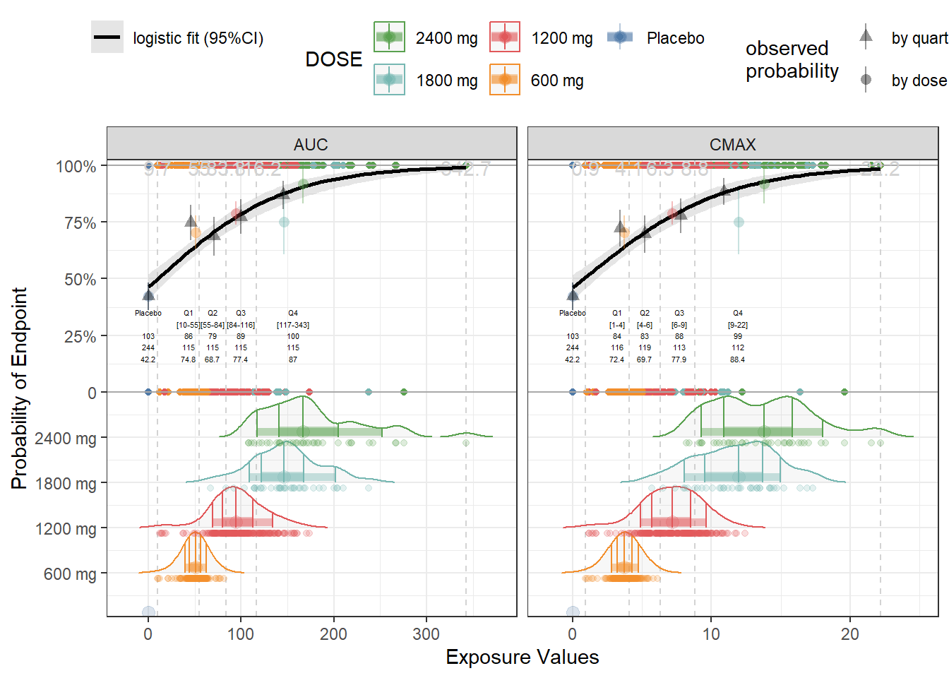 Next we compute the probabilities of response by exposures quartiles and by dose levels and add it to the plot using geom_pointrange