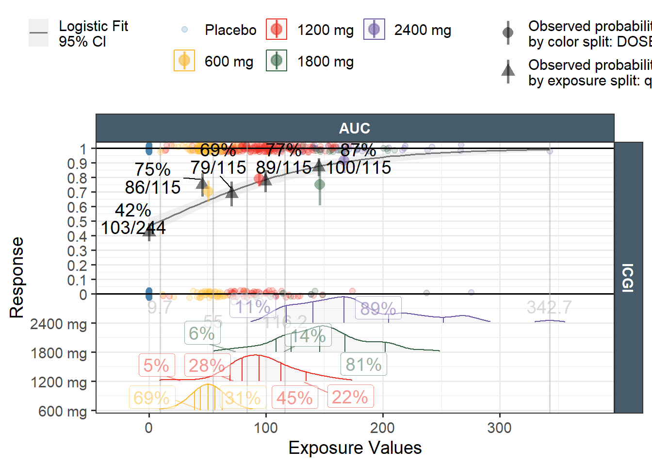 #these values will become an argument in the ER function dist_position_scaler =0.2 dist_offset =0 dist_scale =0.9ICGIlong$keynumeric <--dist_position_scaler *as.numeric( forcats::fct_rev(as.factor(dplyr::pull(ICGIlong[,"DOSE"])))) + dist_offsetp1 <-ggplot(ICGIlong, aes(expvalue,response) )+geom_point(aes(col=DOSE))+geom_hline(yintercept=c(0,1),col="darkgray")+geom_vline(data=exposurelimits,aes(xintercept = intercept),col="lightgray",linetype="dashed")+geom_text(data=exposurelimits,aes(x = intercept,y=Inf,label=round(intercept,1)),col="lightgray",vjust=1)+geom_smooth(method="glm",method.args =list(family ="binomial"),color="black",aes(fill="logistic fit (95%CI)"))+geom_density_ridges(data=ICGIlong %>%filter(DOSE!="Placebo"),aes(expvalue,y=keynumeric,group=DOSE,col=DOSE,height =after_stat(ndensity)),rel_min_height =0.005,alpha=0.1,scale = dist_scale,quantile_lines =TRUE, quantiles =c(0.1,0.25, 0.5, 0.75,0.9))+geom_point(data=ICGIlong%>%filter(DOSE!="Placebo"), aes(expvalue,y=keynumeric-0.025,col=DOSE),alpha =0.2)+facet_grid(~expname,scales="free_x")+ ggthemes::scale_color_tableau()+scale_fill_manual(values="gray")+labs(fill="")+theme_bw()+theme(legend.position ="top")+guides(fill =guide_legend(order =1),color =guide_legend(order =2, nrow=2, reverse =TRUE))