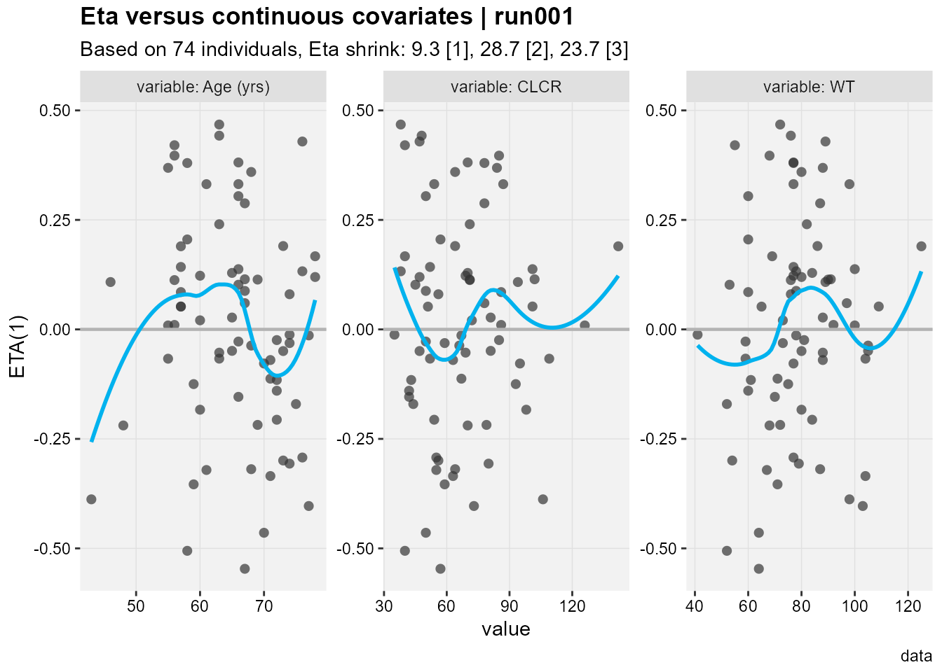 The Eta versus continuous covariates plot shows ETA(1) which is the random effect number one versus the values of the covariates shown in the facet strip of each panel. The run number, number of subjects, eta shrinkages for all eta not just ETA(1) are provided in the title and subtitle, as well as a caption “data”. The xpose.xtras pacakge also support labeling/units of the variable to make the plots more legible yet we still don’t know what ETA(1) refers to.