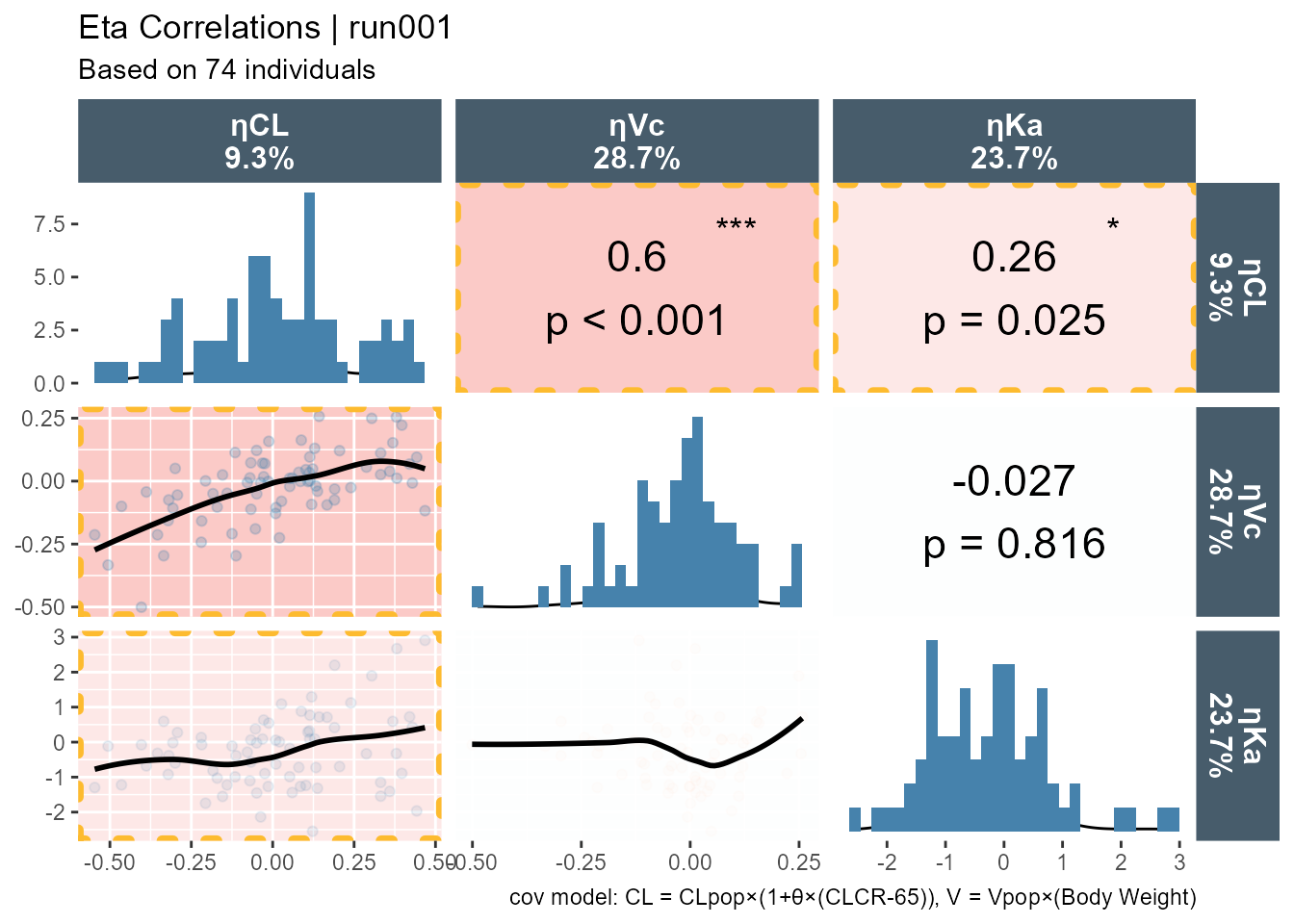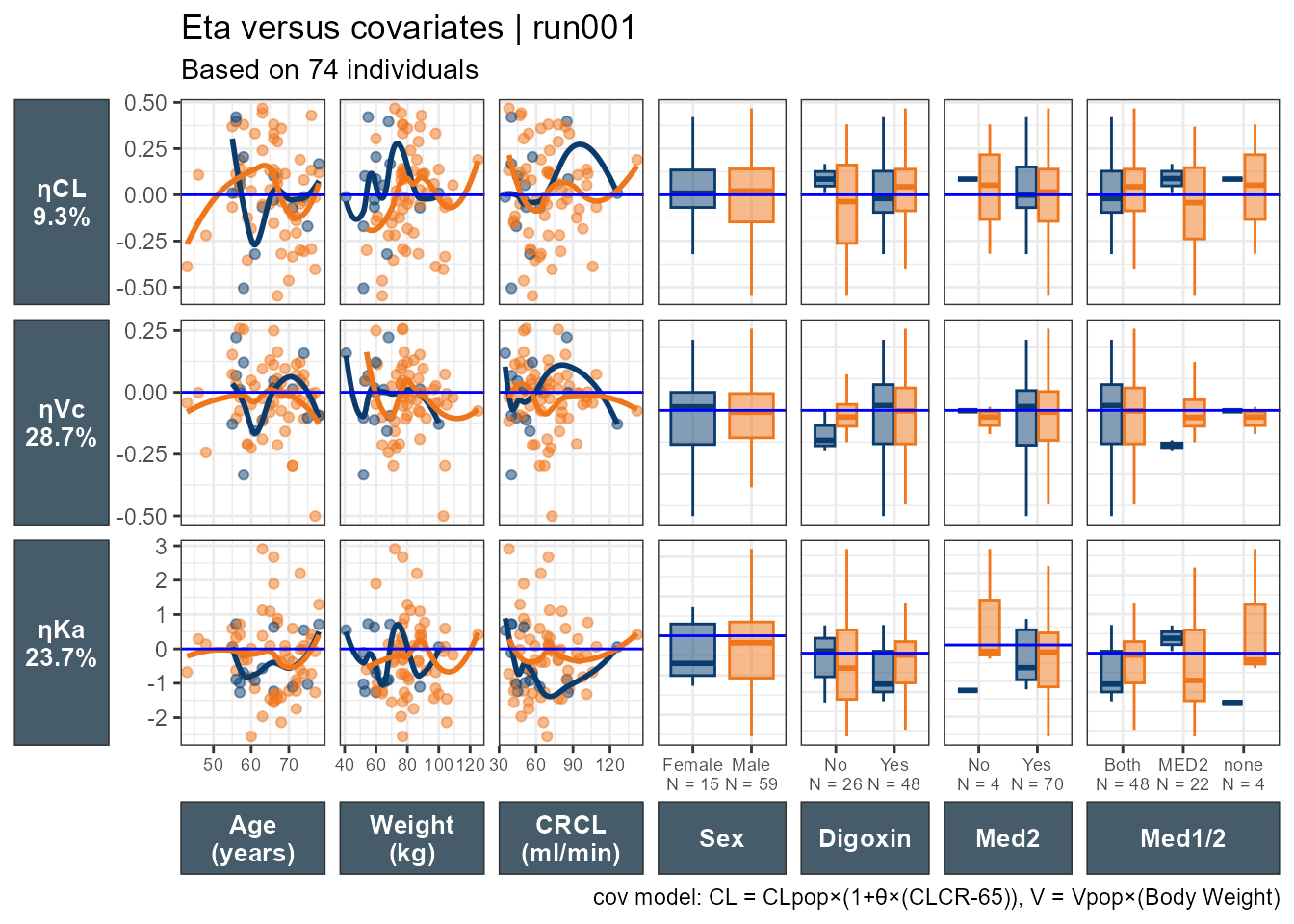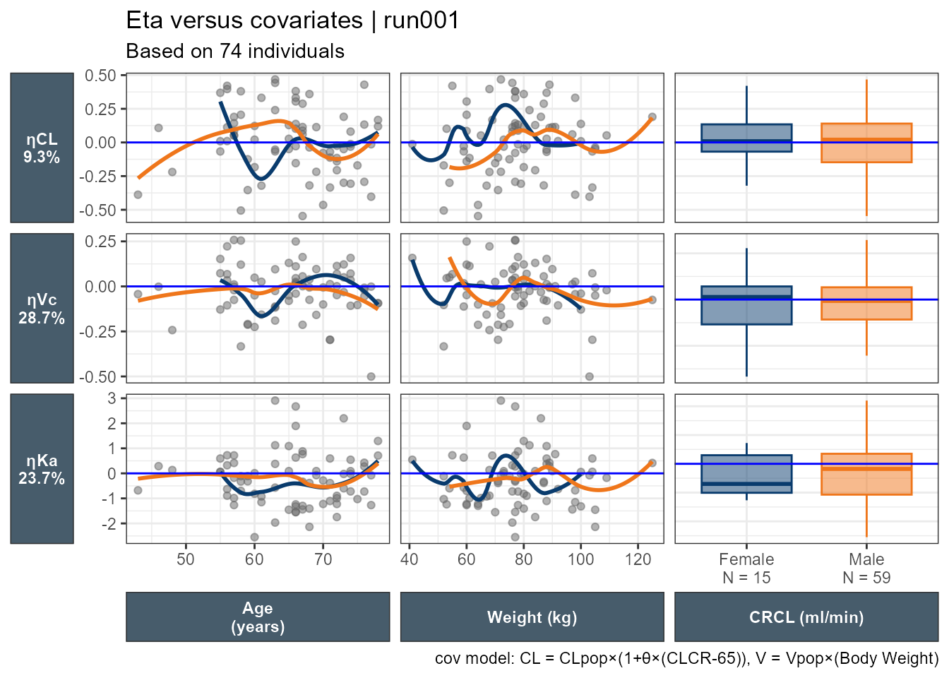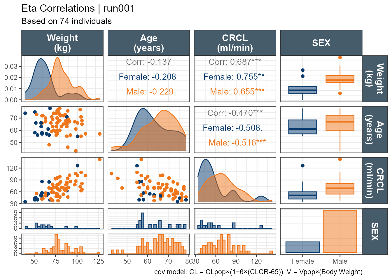 ggpairs(xpdb_xdata,mapping =aes(color = SEX, fill = SEX),columns =c("WT","AGE","CLCR","SEX"),columnLabels =c("Weight\n(kg)","Age\n(years)", "CRCL\n(ml/min)","SEX"), )+theme_bw()+theme(strip.background = ggplot2::element_rect(fill ="#475c6b"), strip.text = ggplot2::element_text(face ="bold", color ="white",size =12))+labs(title ="Eta Correlations | run001",subtitle ="Based on 74 individuals",caption ="cov model: CL = CLpop×(1+θ×(CLCR-65)), V = Vpop×(Body Weight)")+scale_color_manual(values=c("#093B6D", "#EF761B"))+scale_fill_manual(values=alpha(c("#093B6D", "#EF761B"),0.5))