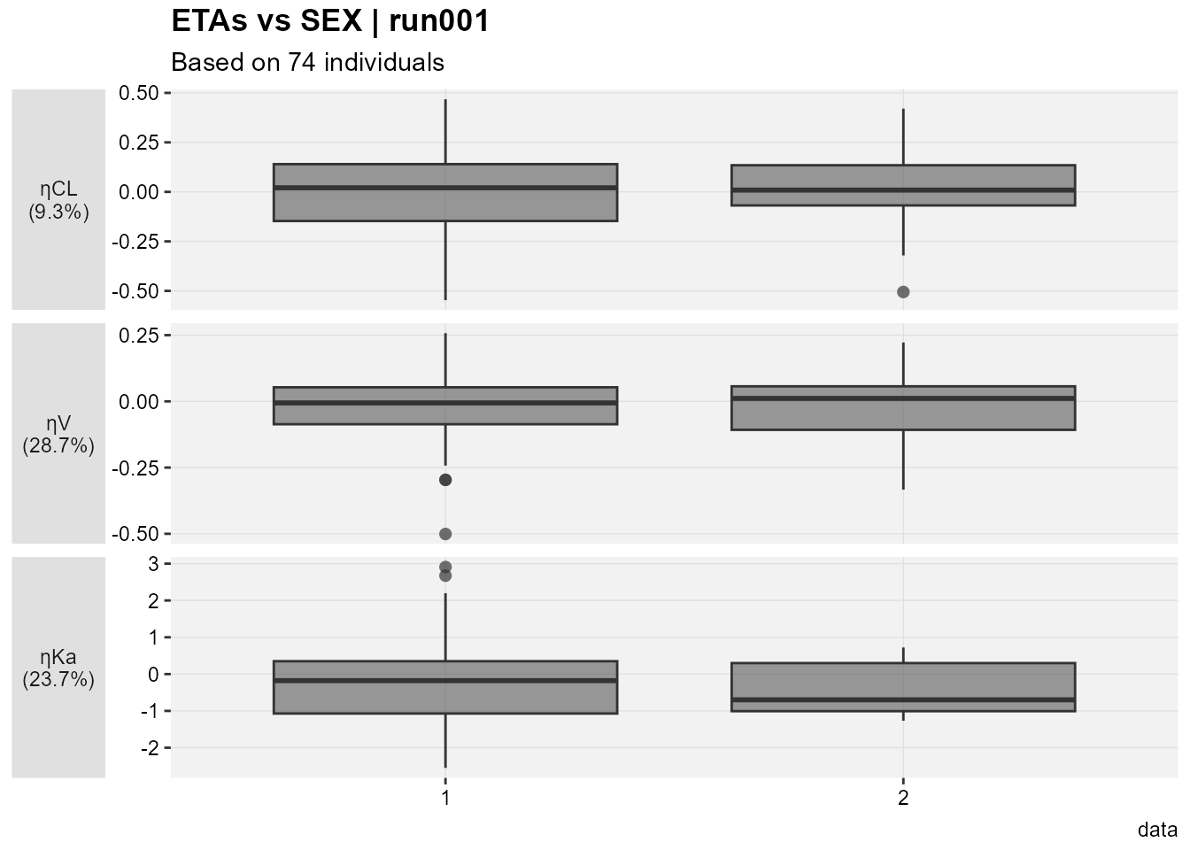 etalables <-c(`ETA(1)`=paste0("ηCL\n(",get_shk(xpdb_x)[1],"%)"),`ETA(2)`=paste0("ηV\n(",get_shk(xpdb_x)[2],"%)"),`ETA(3)`=paste0("ηKa\n(",get_shk(xpdb_x)[3],"%)"))eta_vs_cov(xpdb_x,covariate=c("SEX"))+facet_grid(variable~.,scales="free",switch="y",labeller =labeller(variable=etalables))+labs(x="",y="",subtitle="Based on @nind individuals")+theme(strip.placement ="outside",axis.title.x =element_blank(),axis.title.y.left =element_blank(),strip.text.y.left =element_text(angle=0))