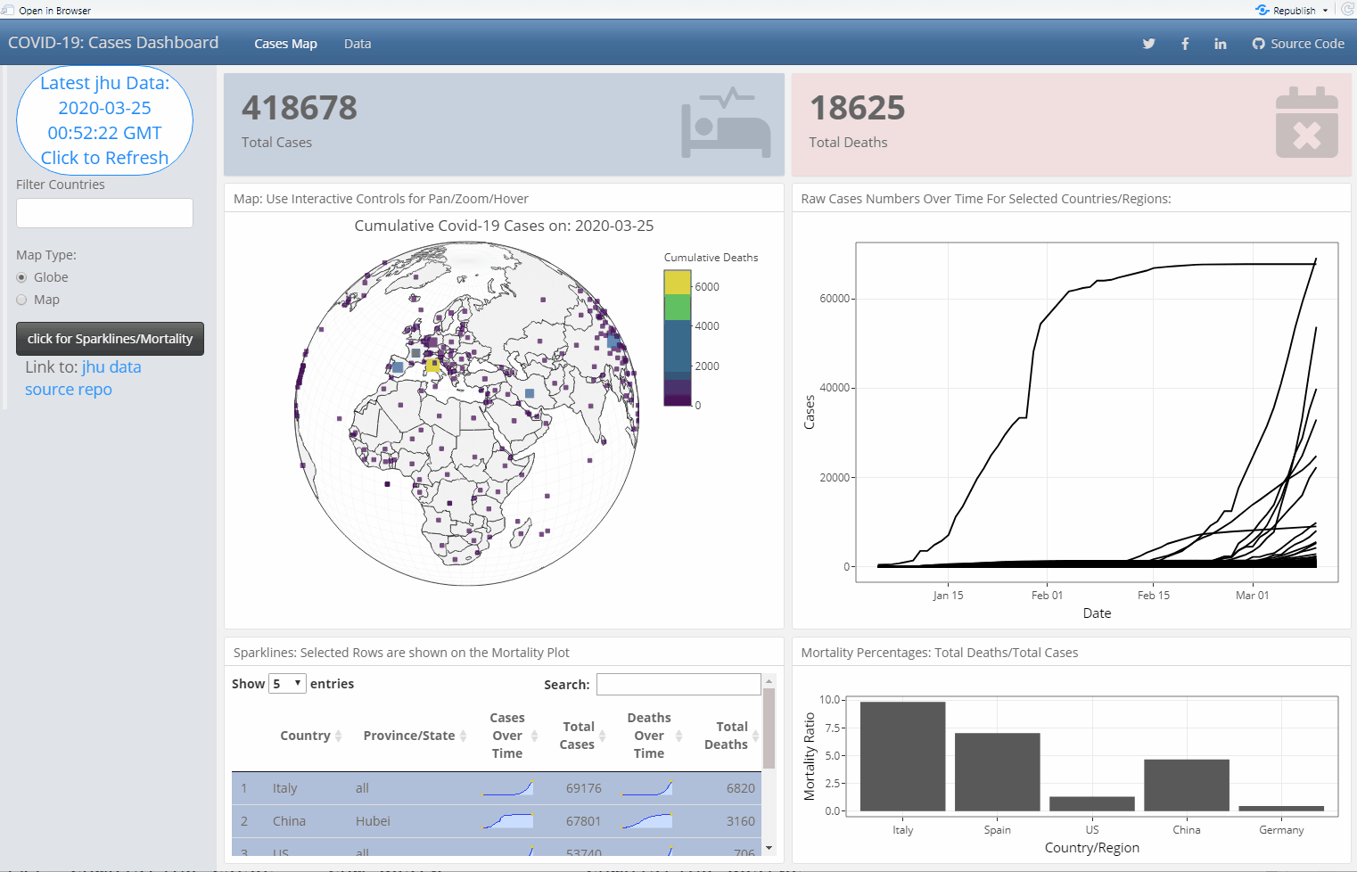 When the COVID-19 pandemic started, there were several live dashboards floating around and I wanted to challenge my dashboarding/R Shiny skills building my own.