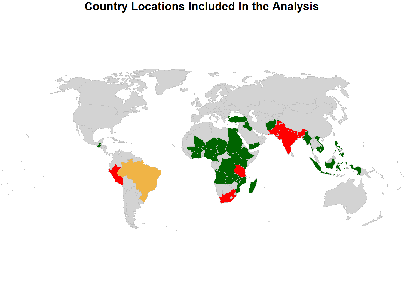 par(mai=c(0,0,0.2,0),xaxs="i",yaxs="i")sPDF <- sPDF[-which(sPDF$ADMIN=="Antarctica"),]sPDF <-spTransform(sPDF, CRS=CRS("+proj=wintri +ellps=WGS84"))sPDF$colCode <-1sPDF$colCode[ which(sPDF$ADMIN %in%c("Brazil"))] <-2sPDF$colCode[ which(sPDF$ADMIN %in%c("Peru","United Republic of Tanzania","South Africa","Bangladesh","India","Nepal","Pakistan"))] <-3sPDF$colCode[ which(sPDF$ADMIN %in%c("Iraq","Turkey", "Yemen","Afghanistan","Cambodia","Indonesia","Myanmar", "Philippines","Vietnam","Guatemala","Chad","Egypt","Sudan","South Sudan","Burkina Faso","Ivory Coast","Ghana","Mali","Niger","Nigeria","Angola","Cameroon","Democratic Republic of the Congo","Burundi","Ethiopia","Kenya","Madagascar","Malawi","Mozambique","Rwanda","Uganda","Zambia"))] <-5#"United States of America","Canada",colourPalette <-c("lightgray","orange","red","orange","darkgreen")mapCountryData( sPDF , nameColumnToPlot="colCode" , mapTitle="Country Locations Included In the Analysis" , colourPalette=colourPalette, catMethod='fixedWidth' , addLegend =FALSE)