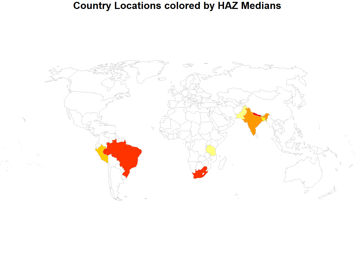 In a previous blog, I referred to my PAGE 2016 poster: Primary Microcephaly: Do All Roads Lead to Rome? which not only had a 3D surface but also a map where the countries that were part of the database were highlighted. I reproduce the poster map and another one colored by country specific height-for-age (HAZ) medians. I read in data, compute stat by country, I join the datasets using joinCountryData2Map matching by ISO2 country codes and use the mapCountryData function and the Winkel Tripel projection:
