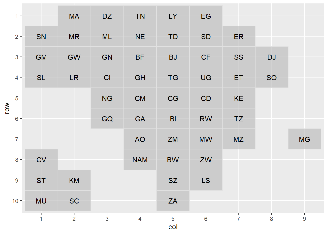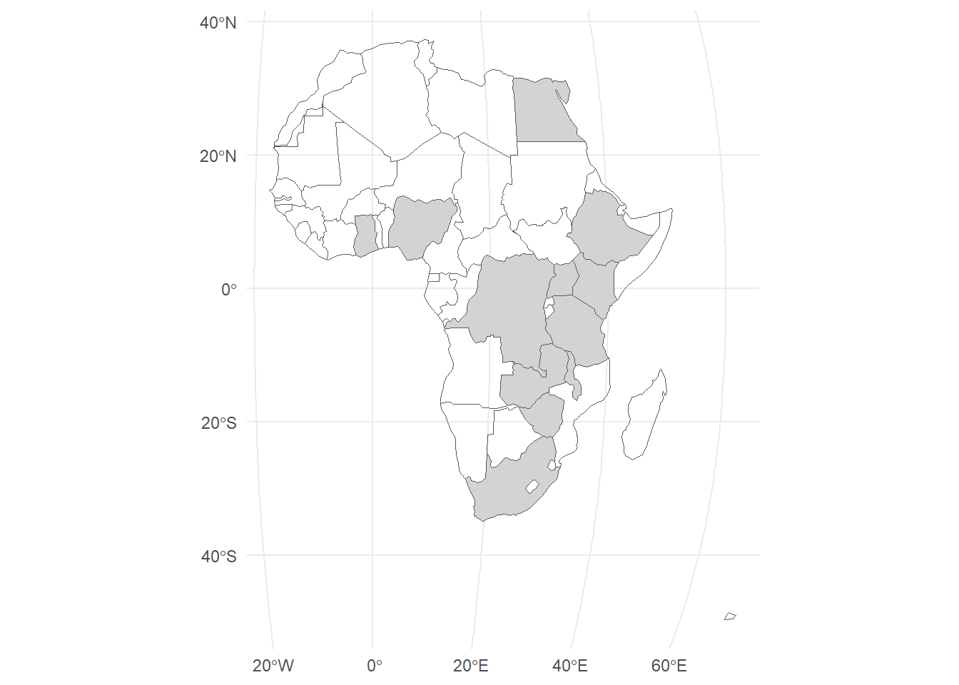 APT2023 <-read.csv("APT2023.csv" )world_sf <-ne_countries(returnclass ="sf") world_sf <-subset(world_sf, admin !="Antarctica") # we don't rly need Antarcticaworld_sf <-subset(world_sf, region_un =="Africa") # we don't rly need Antarcticaworld_sf$colored <-ifelse(world_sf$name_en %in% APT2023$Country,"APT","")# Robinson projectioncrs_robin <-"+proj=robin +lat_0=0 +lon_0=0 +x0=0 +y0=0"# base plotbase <-ggplot() +geom_sf(data = world_sf, size =0.2,aes(fill=colored),show.legend =FALSE) +scale_fill_manual(values=c("transparent","lightgray"))# worldp1 <- base +theme_minimal() +coord_sf(crs = crs_robin)p1