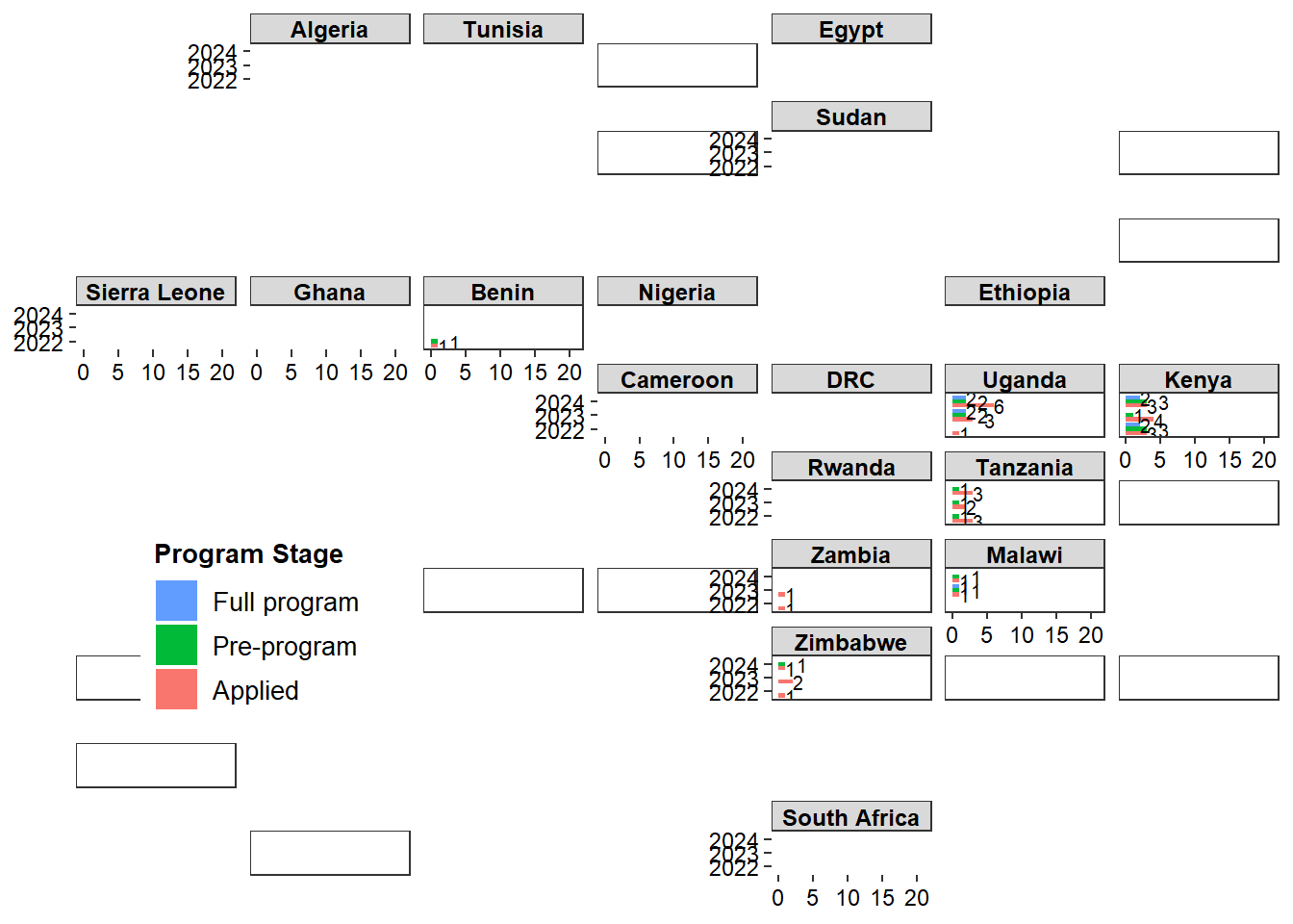 ggplot(dat, aes(applied2, value, fill = status)) +geom_col(position =position_dodge(width =0.9, preserve="single"), alpha =1) +coord_flip() +theme_bw() +facet_geo(~ Country2, grid = my_grid, label ="name") +geom_text(aes(applied2, value, label = label2), hjust =0, size =2.7, position =position_dodge(width =0.9)) +theme_bw() +theme(axis.text =element_text(size =9, color ="black"),axis.title =element_blank(),legend.title =element_text(size =10, face ="bold"),legend.text =element_text(size =10),strip.text =element_text(size =9, color ="black", face ="bold", margin =margin(0.05,0,0.05,0, "cm")),panel.grid.major =element_blank(), panel.grid.minor =element_blank(),legend.position =c(0.15, 0.3) ) +scale_y_continuous(breaks =seq(from =0, to =20, by =5), limits =c(0, 21)) +guides(fill =guide_legend(reverse =TRUE)) +labs(fill ="Program Stage")