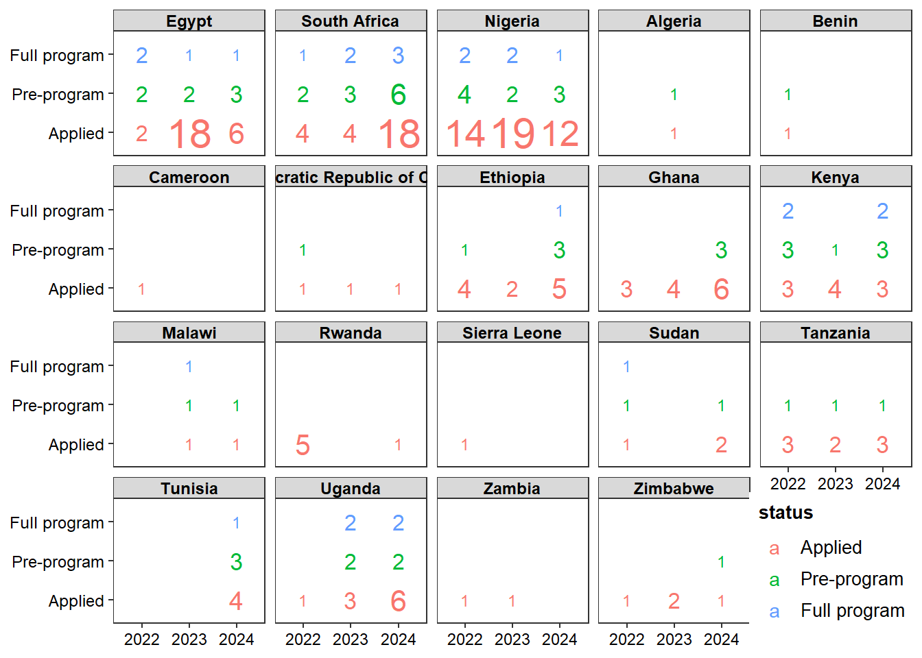 The most recent paper on the same capacity development program Advancing pharmacometrics in Africa-Transition from capacity development toward job creation, had a more elaborate Africa map outline and where used geofacet to show country specific statistics. Unfortunately facet_geo is currently broken and I add another plot that was not in the paper and the Africa map outline which were later combined in PowerPoint.