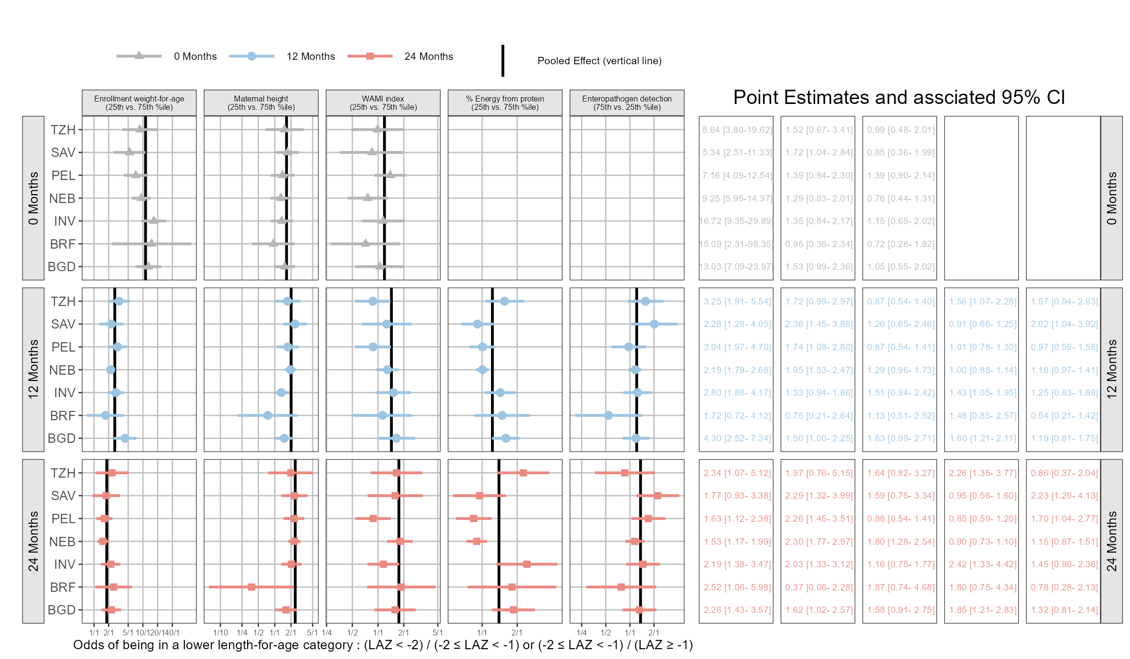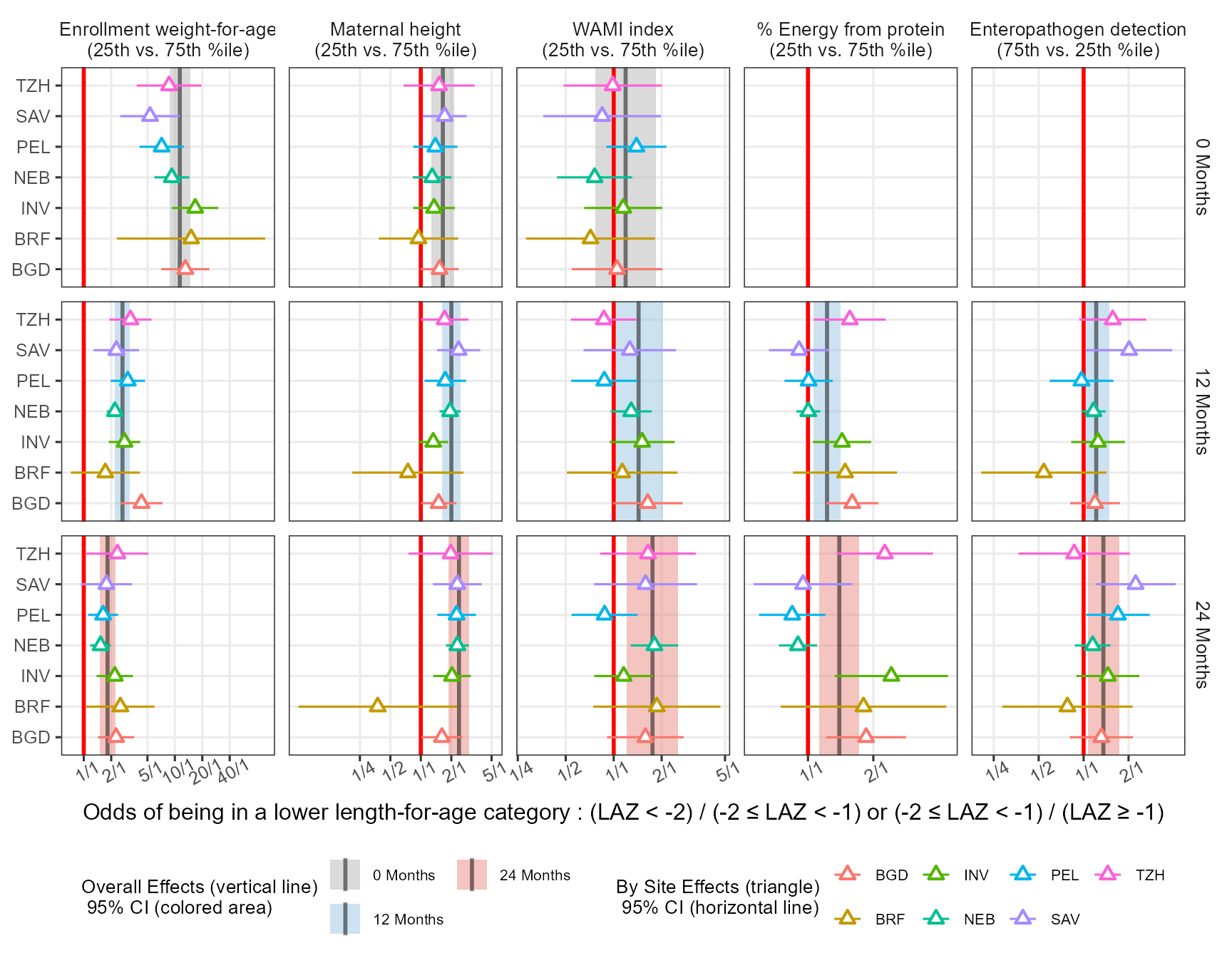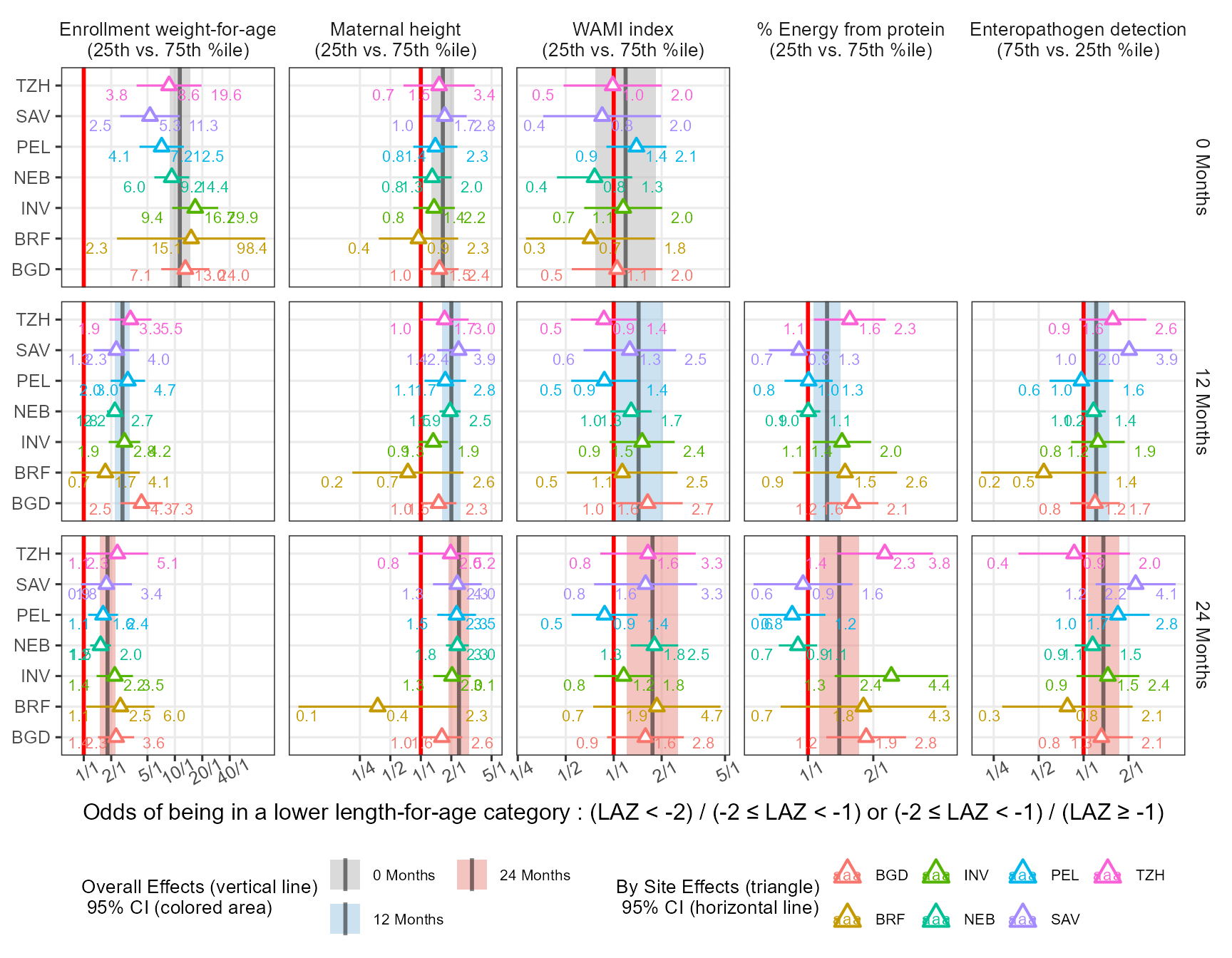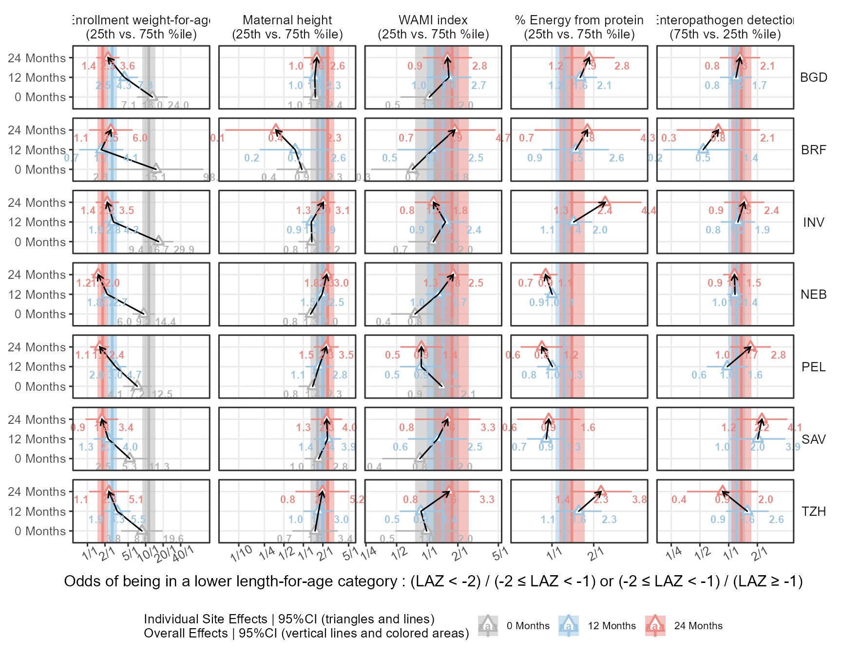 xlabel = "Odds of being in a lower length-for-age category : (LAZ < -2) / (-2 \u2264 LAZ < -1) or (-2 \u2264 LAZ < -1) / (LAZ \u2265 -1)",