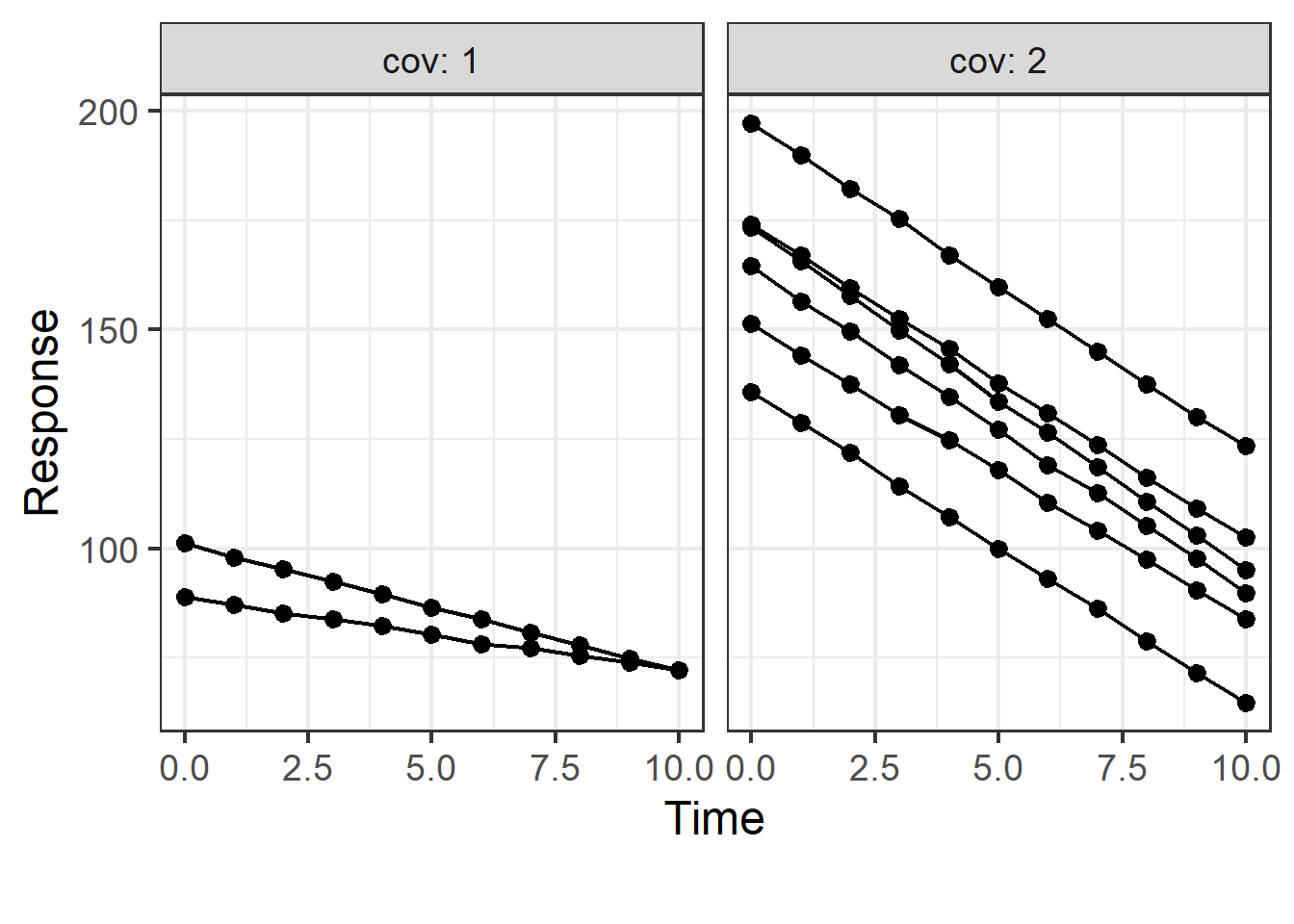 The plot above shows the response versus time split by covariate and we can see that the intercept and slope differ by covariate value and that we have a total of eight subjects with unbalance i.e. two IDs having covariate value of 1 and six IDs having a value of 2. Next, we fit a series linear mixed effects models.