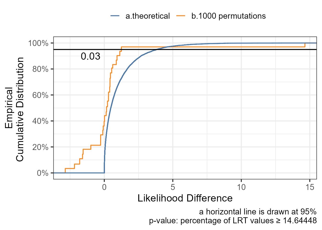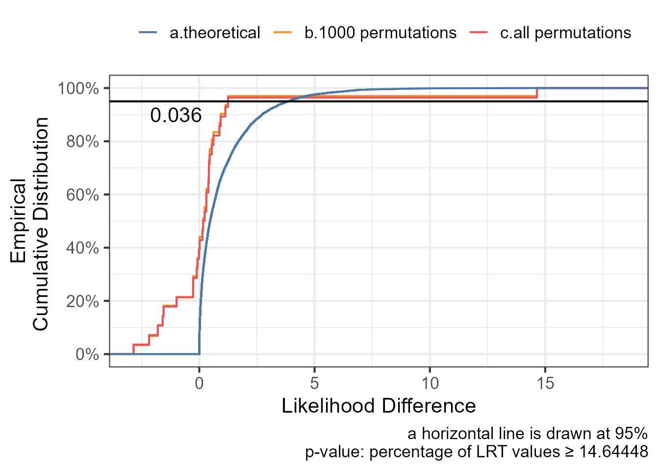 ggplot(data.frame(lrt=lrt_null_distribution,perm=1:length(lrt_null_distribution)),aes(lrt)) +geom_step(stat="ecdf",aes(col="b.1000 permutations"))+geom_step(data=data.frame(lrt=lrt_null_distribution_all),stat="ecdf",aes(col="c.all permutations"))+geom_step(data=data.frame(lrt=rchisq(n =10000, df =1)),stat="ecdf",aes(col="a.theoretical"))+geom_hline(yintercept =0.95)+annotate(geom="text", x =-1, y =0.90, label=round(p_value_permutation_all,3))+ ggthemes::scale_color_tableau()+theme_bw(base_size=16)+theme(legend.position ="top")+theme(legend.position ="top")+labs(col="",x="Likelihood Difference",y="Empirical\nCumulative Distribution ",caption ="a horizontal line is drawn at 95% p-value: percentage of LRT values ≥ 14.64448")+scale_y_continuous(breaks=seq(0,1,0.2),labels = scales::percent_format())