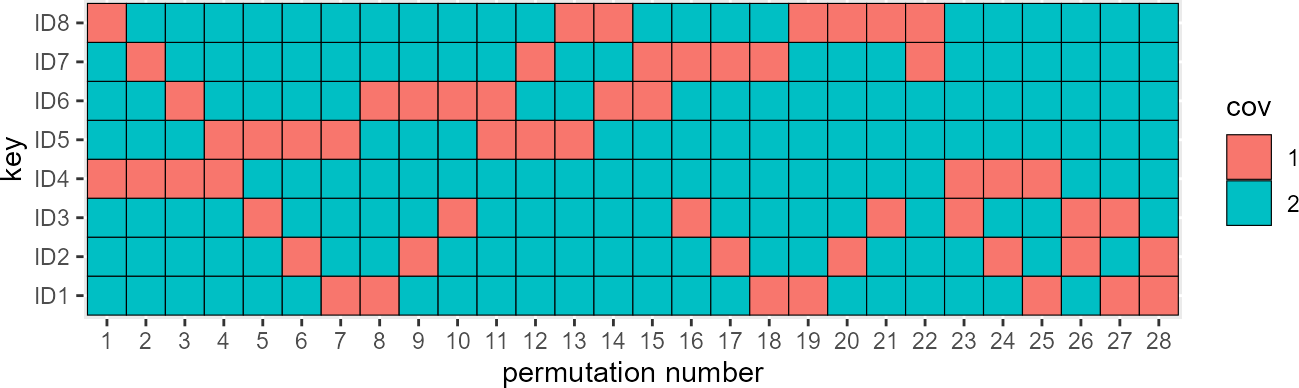 The randomization test has shown that the model with covariate on slope is better than the model with covariate on intercept with a p-value of 0.03 which confirm the original data 14.65 points difference in -2LL. The procedure above randomly permuted the covariate values across the individuals a 1000 times. But wait a minute, we only have 8 subjects with 6 having covariate = 1 and 2 having covariate = 2 how many possible total permutation we have ? We will can compute that we have a total of 28 unique permutations and that we could have run the 28 models to have the full distribution of the LRT. This is what we are doing next !