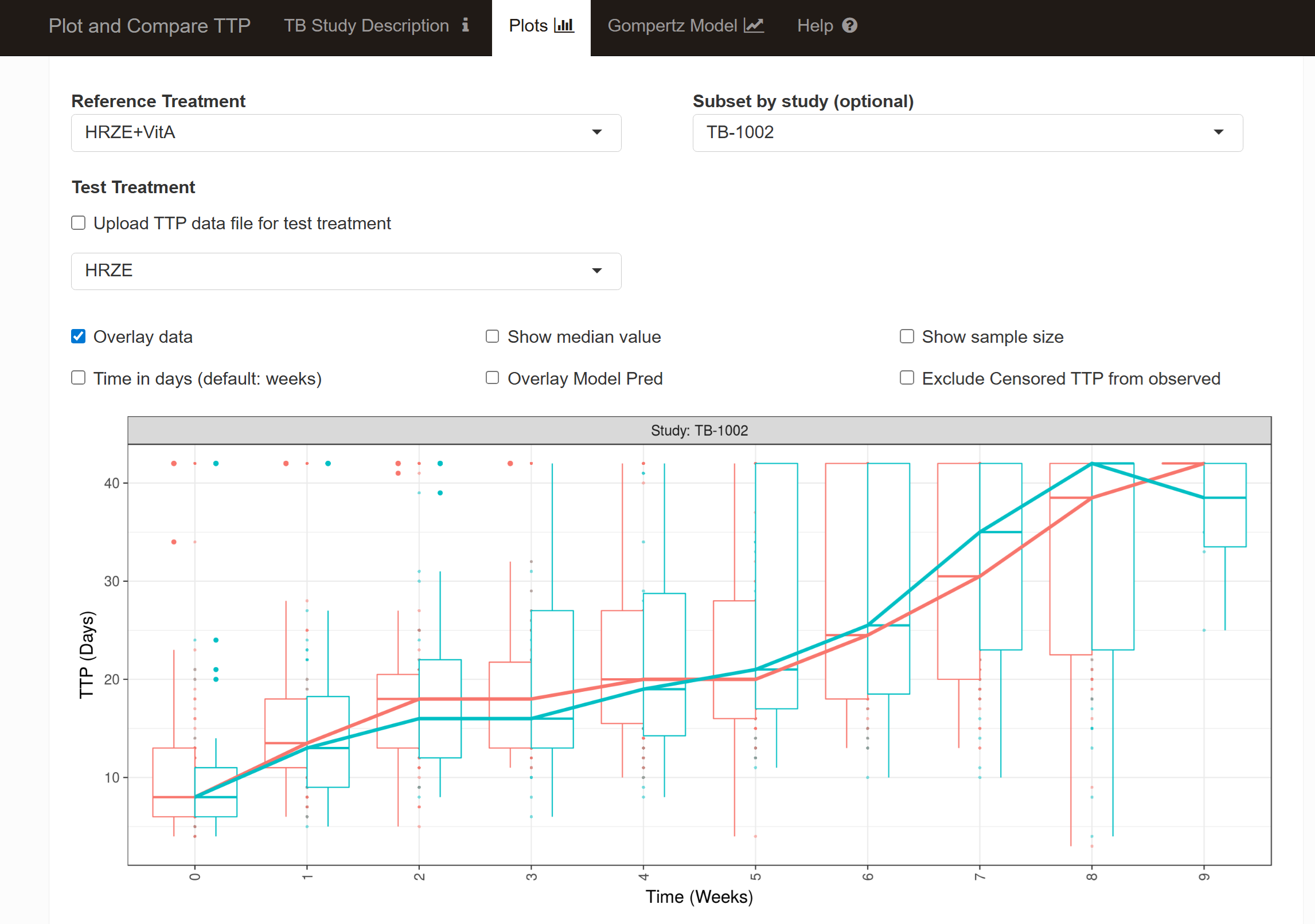 The app allowed the user to plot and compare TTP data using boxplots, and also had the option to upload newly generated data as they came in so researcher can contrast with previous studies a example graph that could be generated in the app is shown below: