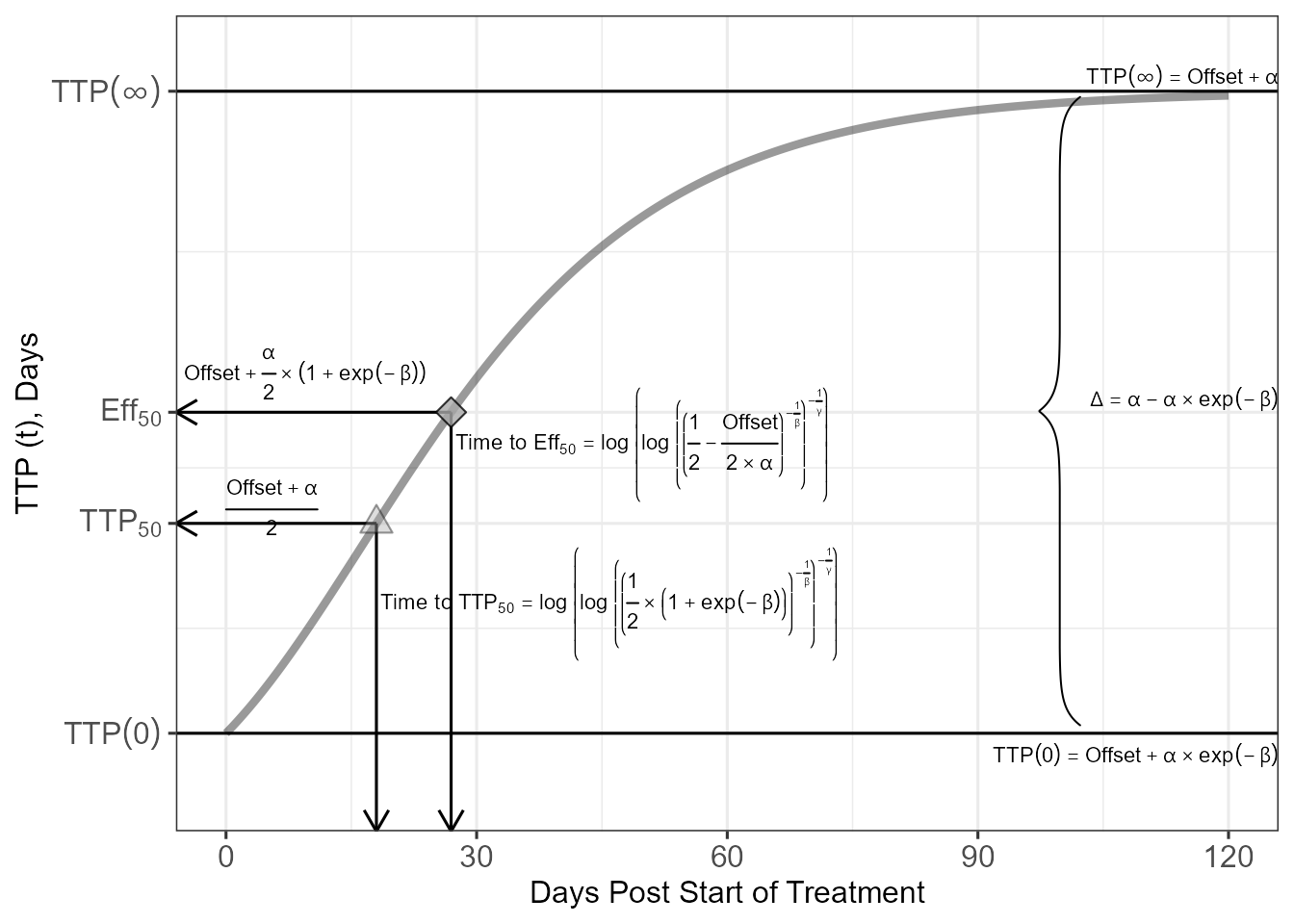 labs(y="TTP (t), Days",x="Days Post Start of Treatment",shape="",fill="",