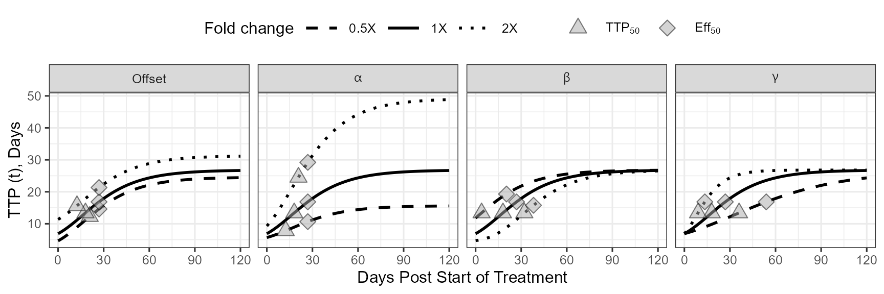 Next, I wanted to illustrate the impact of each parameter on the curve by keeping a reference curve unchanged (1X) across the panels and then in each panel I vary one parameter at the time by doubling (2X) and halving it (0.5X). TTP50 and EFF50 are also computed and represented using a triangle and a diamond, respectively.
