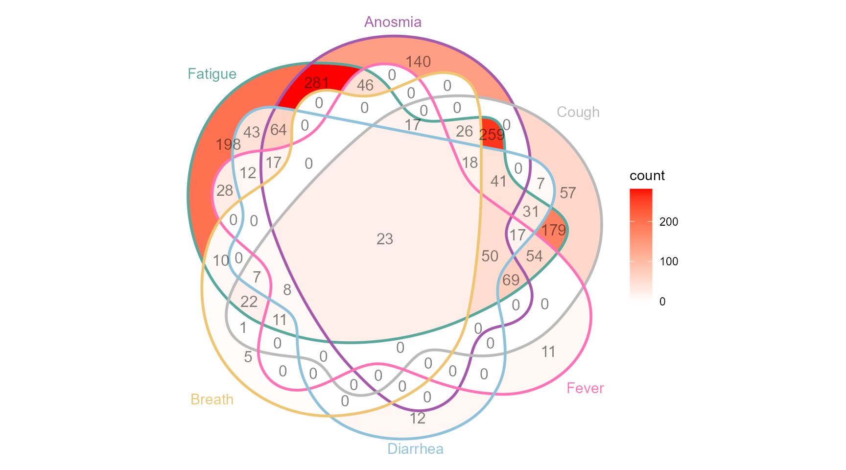What if I want to highlight a particular combination of symptoms? This is what queries are for controlling which intersection / set to highlight. I also illustrate how to make the Set Size axis logged: