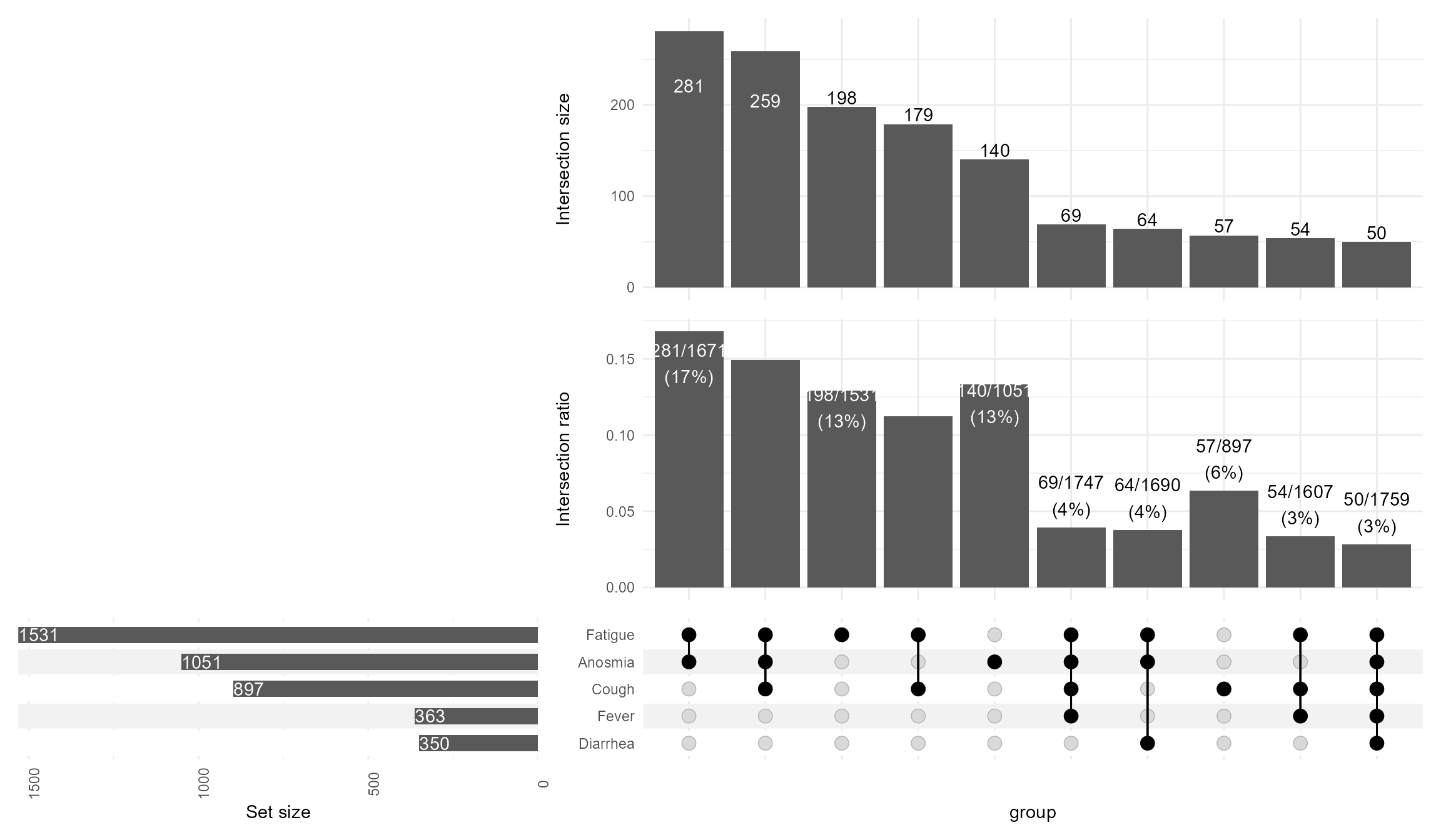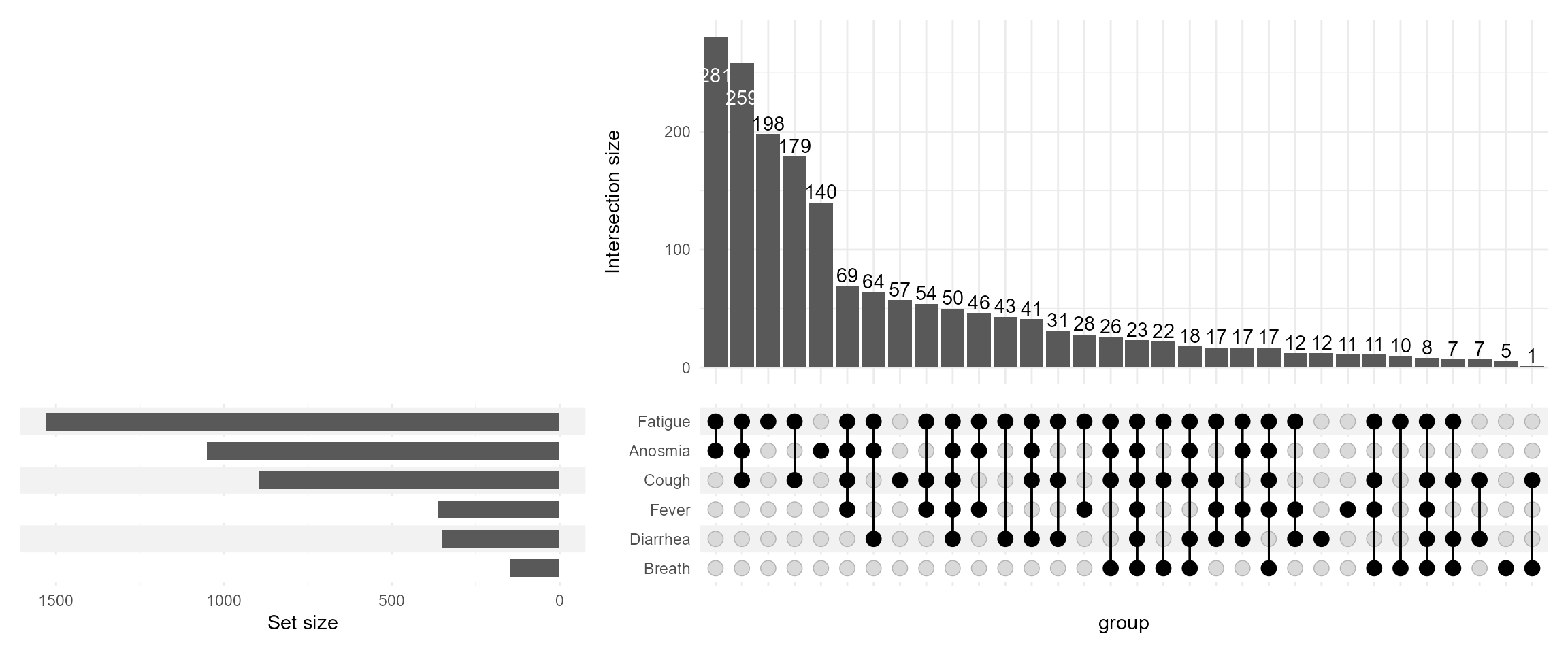 During PAGE 2024, I presented with one of my former colleagues a poster on Upset Plots. I am revisiting this cool way to visualize and present intersections of data when we have many possibilities. I will focus on one of the examples on COVID-19 symptoms, demonstrating some useful features, merely scratching the surface of what Upset Plots can do. For more details on the methodology refer to this website https://upset.app/. The original authors also provide a web-app.