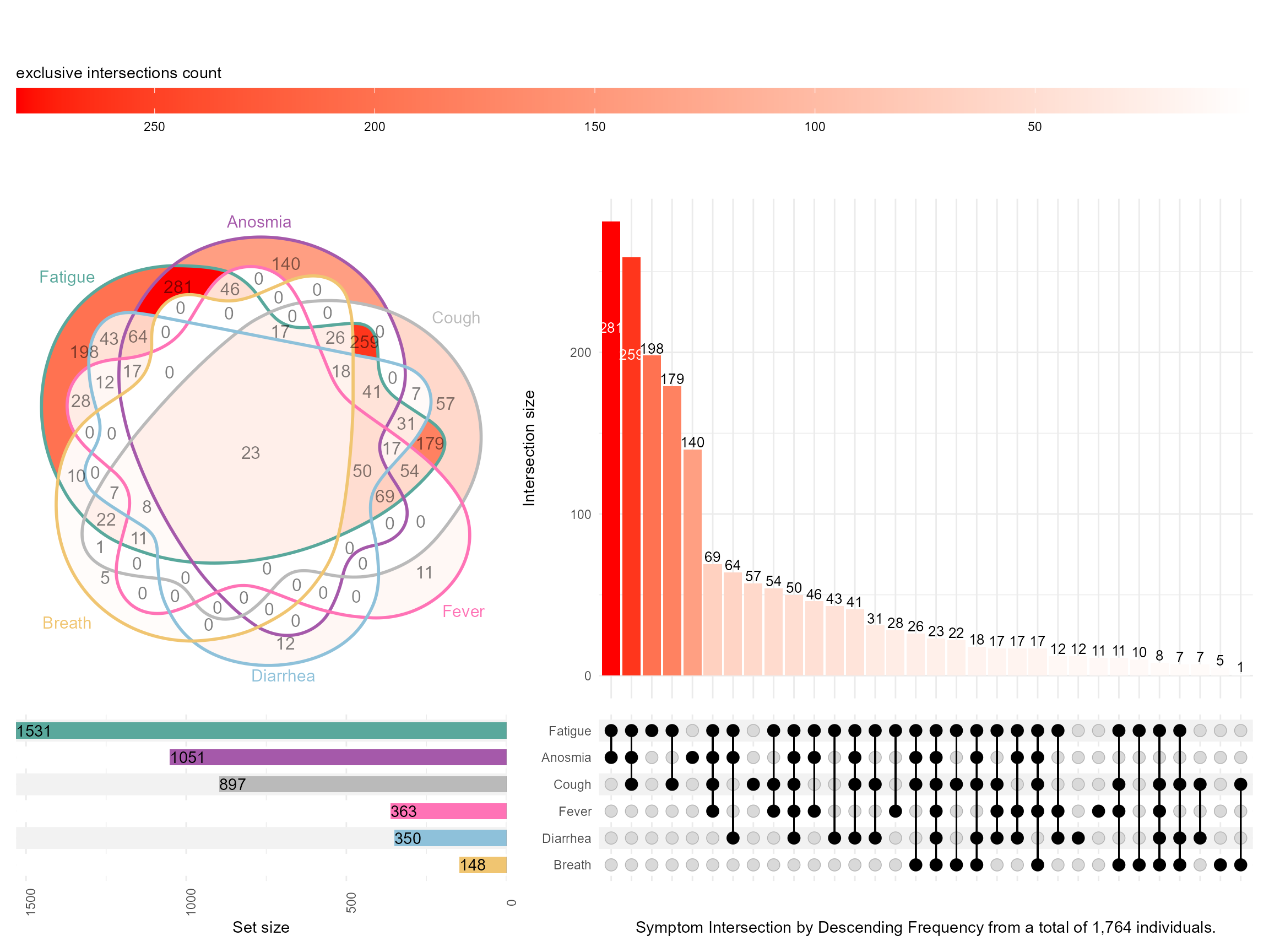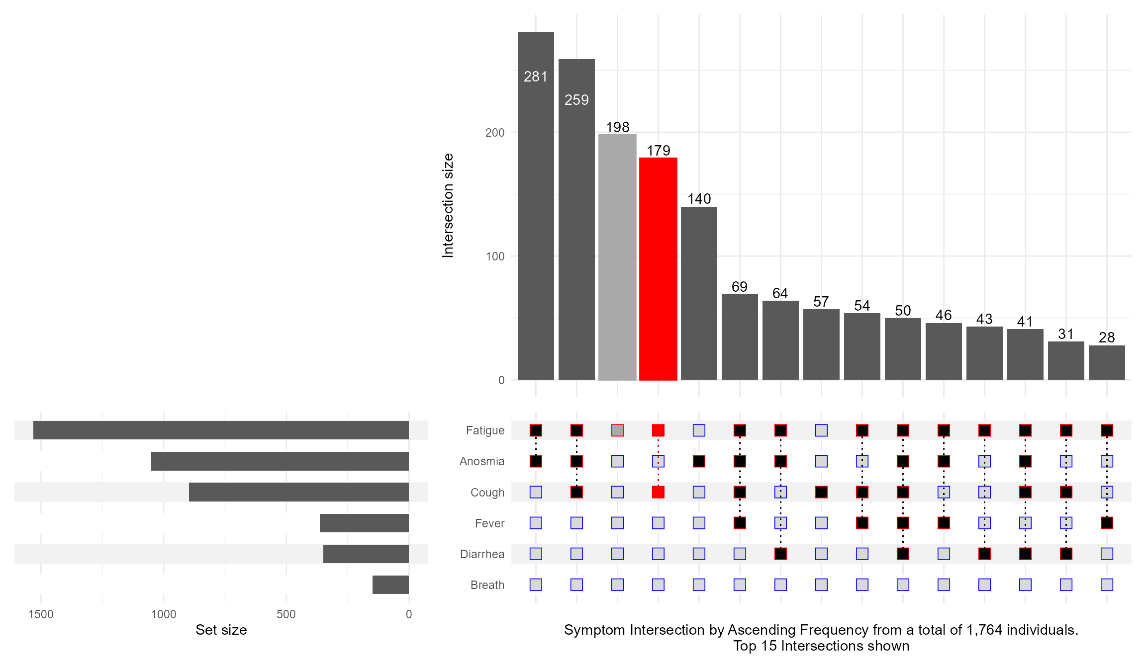 upset(data = symptom_expand, intersect = symptoms, encode_sets=FALSE, matrix=(intersection_matrix(geom=geom_point(shape='square',size=3.5 ),segment=geom_segment(linetype='dotted' ),outline_color=list(active='red',inactive='blue' ) ) ),queries=list(upset_query(intersect=c('Fatigue', 'Cough'),color='red', fill='red',only_components=c('intersections_matrix', 'Intersection size') ),upset_query(intersect=c('Fatigue'),color='darkgray', fill='darkgray',only_components=c('intersections_matrix', 'Intersection size') ) ),keep_empty_groups=TRUE,width_ratio=0.4,n_intersections=15,name="Symptom Intersection by Ascending Frequency from a total of 1,764 individuals.\nTop 15 Intersections shown", )