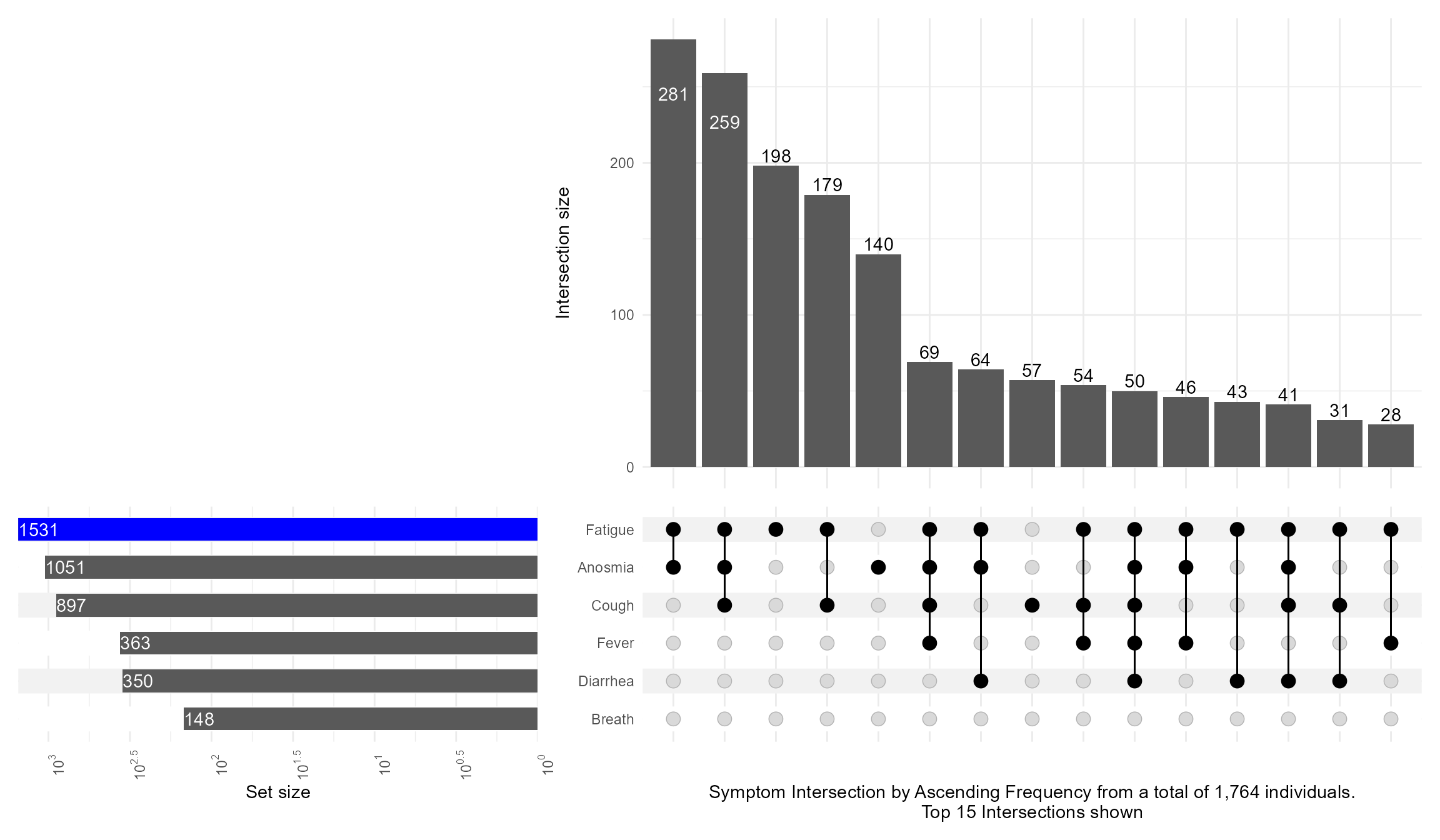 upset(data = symptom_expand, intersect = symptoms, set_sizes=(upset_set_size()+geom_text(aes(label=..count..), hjust=0, stat='count',col="white")+theme(axis.text.x=element_text(angle=90))+scale_x_continuous(expand=expansion(add =0, mult =0))+scale_y_continuous(breaks = scales::trans_breaks("log10", function(x) 10^x),labels = scales::trans_format("log10", scales::math_format(10^.x)),trans=reverse_log_trans(),expand =expansion(add =0, mult =0)) ),queries=list(upset_query(set='Fatigue', fill='blue')),keep_empty_groups=TRUE,width_ratio=0.4,n_intersections=15,name="Symptom Intersection by Ascending Frequency from a total of 1,764 individuals.\nTop 15 Intersections shown", )